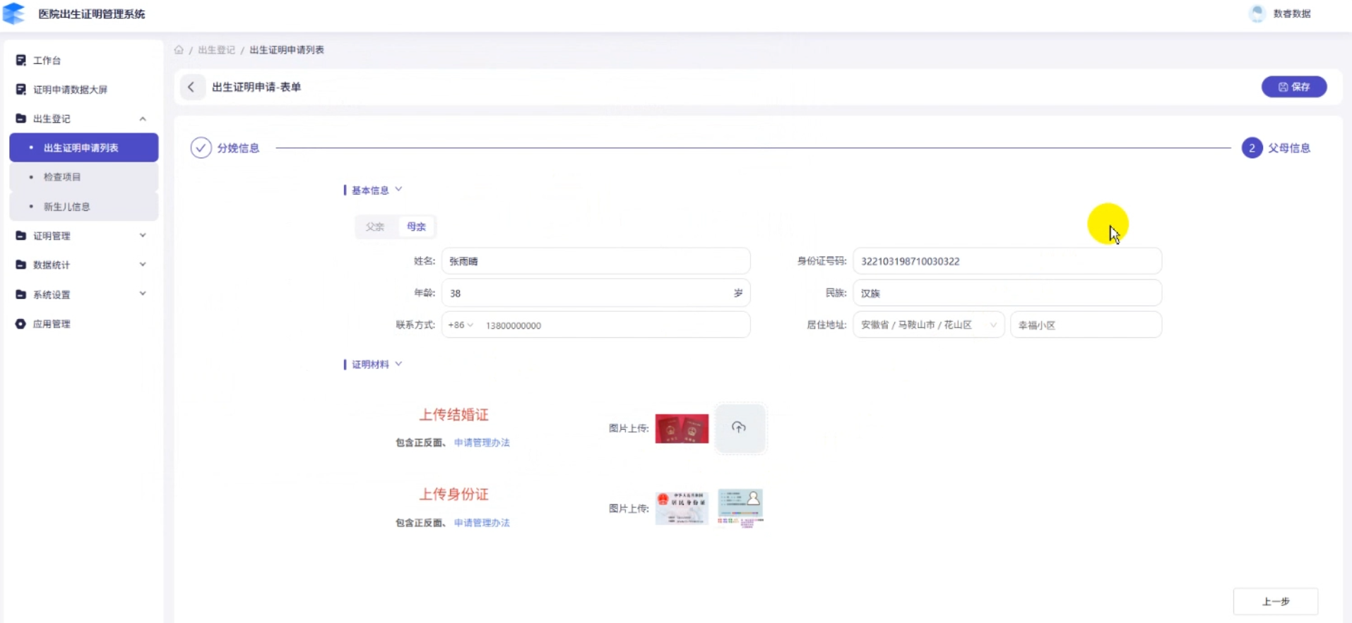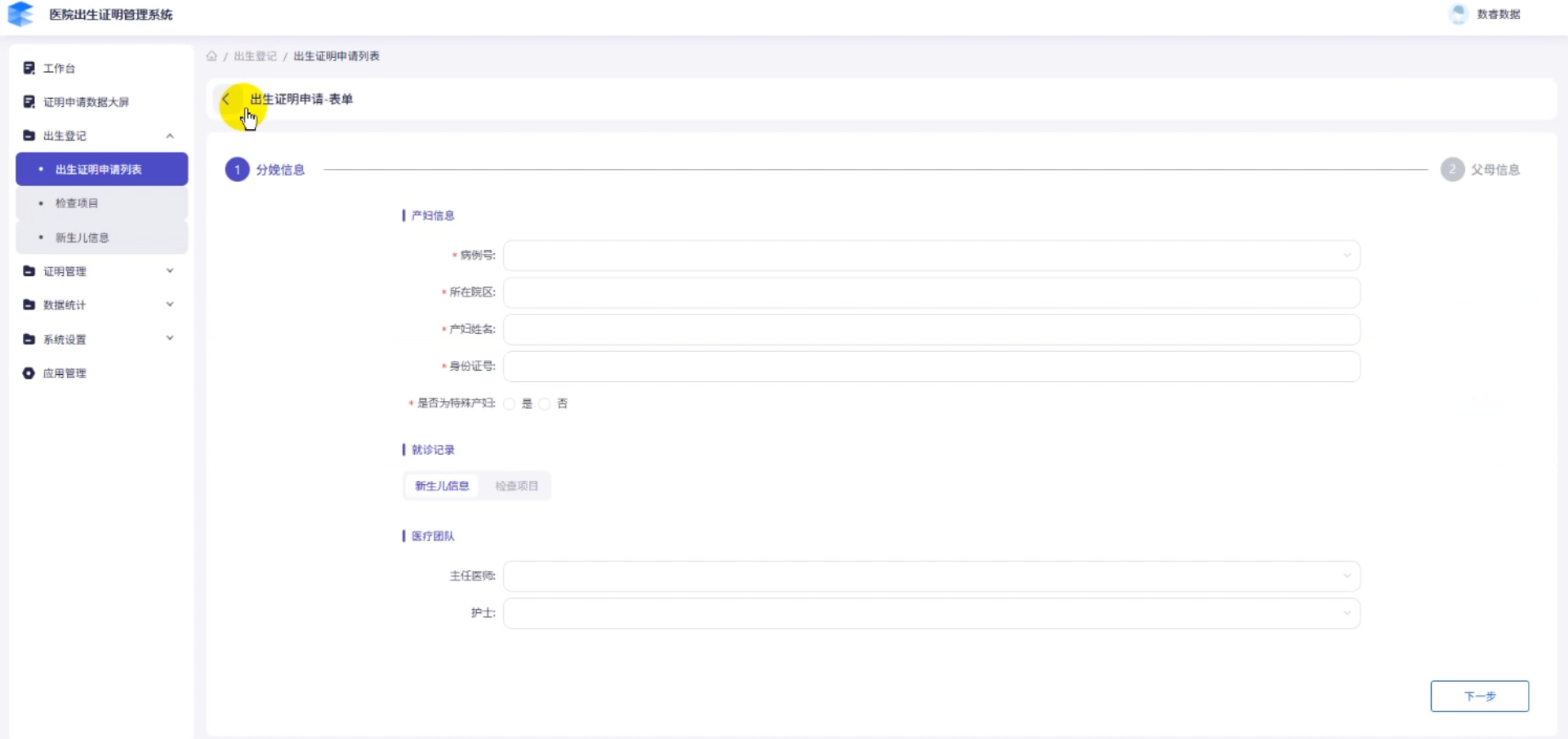 为提升填写体验,我们使用步骤条布局将表单分为“分娩信息”与“父母信息”两步,逐步引导用户完成填报。