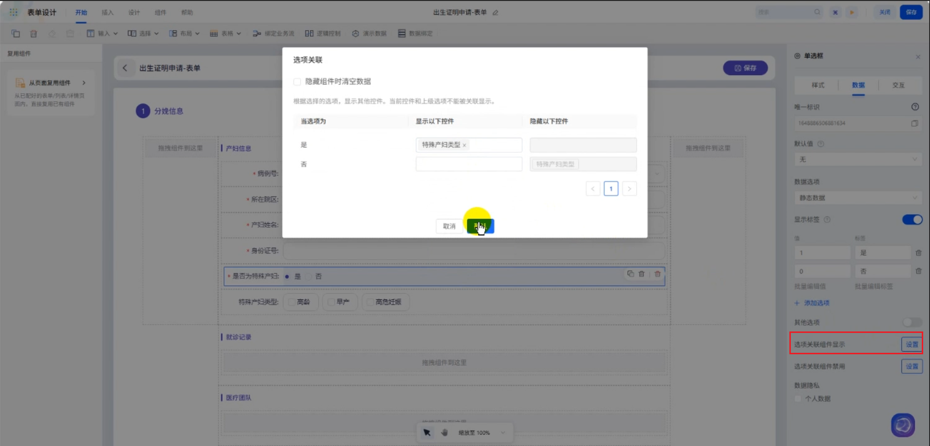 特殊产妇类型组件只有在用户选择【是】的时候才会显示,因此我们选中单选框组件,设置组件联动显示。
