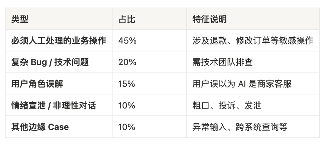 团队系统分析了所有转人工的 Case,发现主要原因有: