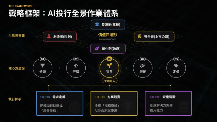 AI 科技投行是一个宏大的战略体系。我们采用价值四边形模型,整合高校、科创企业、上市公司与政府多方力量。通过需求定义、方案竞赛、资产沉淀的“三步走”路径,将模糊的战略意图转化为可复用的解决方案库。