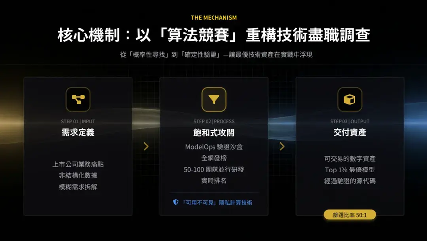 那么,如何验证这些技术资产的价值?我们的核心机制是算法竞赛。传统技术尽调依赖专家主观判断,而现在我们通过竞赛实施尽调,从“概率性寻找”转向“确定性验证”。让众多团队在公平环境中同台竞技,以代码和结果为导向,使最优质的技术资产在实战中脱颖而出。