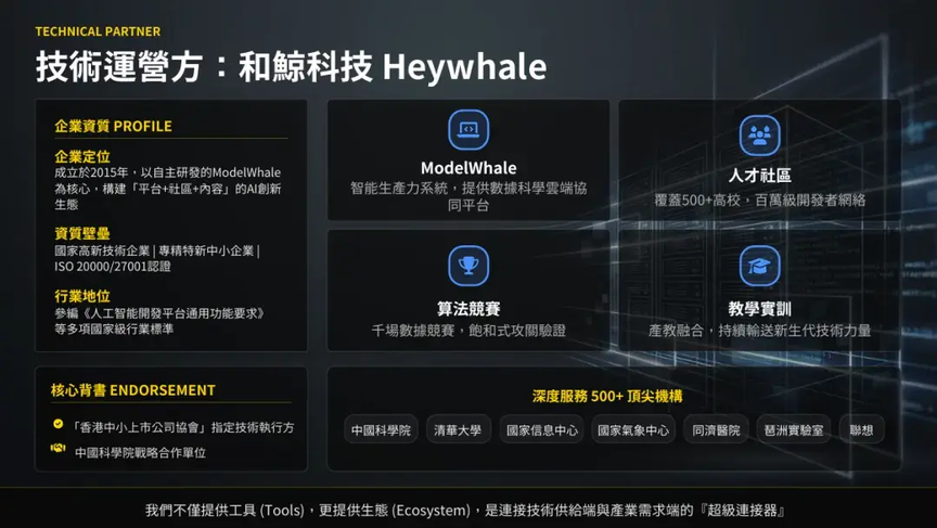 总而言之,我们致力于构建一个完整的价值闭环。通过“社区+竞赛”模式,解决资本与技术的错配问题,并基于 ModelOps 基座实现边际成本优势。这是一条由场景资本与技术生态双螺旋驱动的上升通道,二者相互咬合,协同进化。作为执行方,和鲸科技已做好准备。我们是 AI 创新生态的构建者,拥有 ModelWhale 智能生产力系统,具备国家高新技术企业、专精特新中小企业资质,并参与了多项国家级标准的编撰工作。我们既有能力,也有实力,将这份蓝图转化为现实。