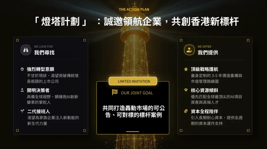 今天,我们在此正式发起“灯塔计划”。我们正在寻找志同道合的合作伙伴——那些具备强烈转型意愿的上市公司、拥有开明视野的决策者,以及渴望证明自己的二代接班人。我们将提供顶级的战略护航、核心资源倾斜与全程资本陪伴,共同打造一批具有示范意义的标杆案例。