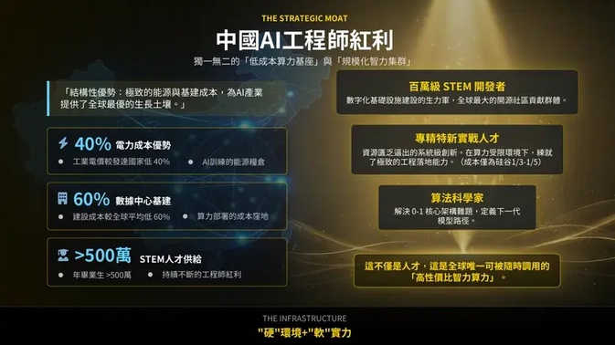 这一智能工厂的核心产品即是 AI 港股通。它就像一个 CPU(中央处理器):输入端是沉睡的资本与科创资产,输出端则是标准化的孵化流程。我们的目标清晰明确:培育科技链主企业,助力其迈向百亿市值。在背后支撑 AI 港股通的是中国的结构性优势。除了前面提到的人才成本,我们还有极致的基建成本。中国的工业电力成本比国外低 40%,数据中心建设成本低 60%。这意味着,我们不仅有人才,还有高性价比的智力资源。