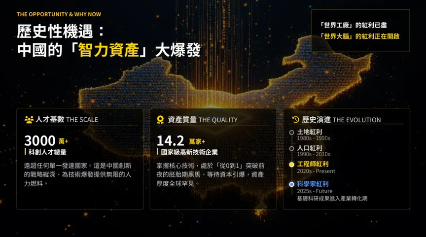 首先,让我们看看我们脚下这片土地正在发生什么。回顾过去四十年,中国经济的腾飞依赖于几波巨大的红利。上世纪 80 年代到 90 年代,我们靠的是土地红利;90 年代到 2010 年,我们吃的是人口红利,是制造业的黄金时代。而现在,2020 年代,我们正身处一个全新的红利期——“工程师红利”。请大家记住这两个数字:中国拥有超过 3000 万的科创人才总量,拥有超过 14.2 万家国家级高新技术企业。这不仅仅是数字,这是技术爆发的“人力燃料”。2025 年之后,“科学家红利”将进一步显现,中国正步入智力资产密集爆发的阶段,这是我们握在手中的关键优势。