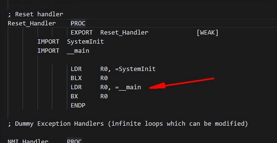 这个是嵌入式的汇编启动代码,中间的一部分,写的是,在启动的过程中,指定了要执行的__main 函数。