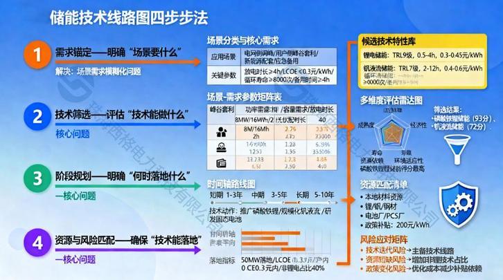 制定储能技术线路图,不是 “罗列热门技术”,而是通过 “需求锚定 - 技术筛选 - 阶段规划 - 资源匹配” 的科学方法,找到 “场景、技术、资源、时间” 的最佳平衡点。其核心原则有二:
