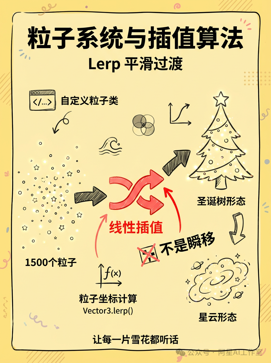 • 技术点: 自定义粒子类与 Lerp (线性插值) 。