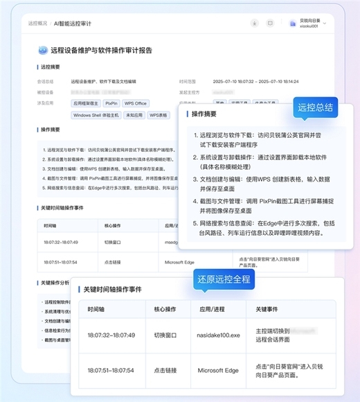 这意味着,安全管理员或 IT 主管无需再耗费数小时观看录像,即可在几分钟内掌握一次复杂远程支持的全貌,快速定位违规操作或故障源头,审计效率得到质的飞跃。