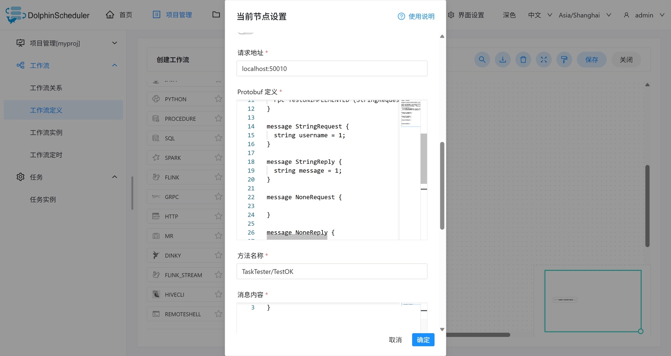 完成 DolphinScheduler gRPC 插件设计与开发,可以实现在 java 运行时中动态发起 gRPC 调用,提供了和 gRPC 调试场景相似的配置模式,可以复用相关配置文件和测试消息。