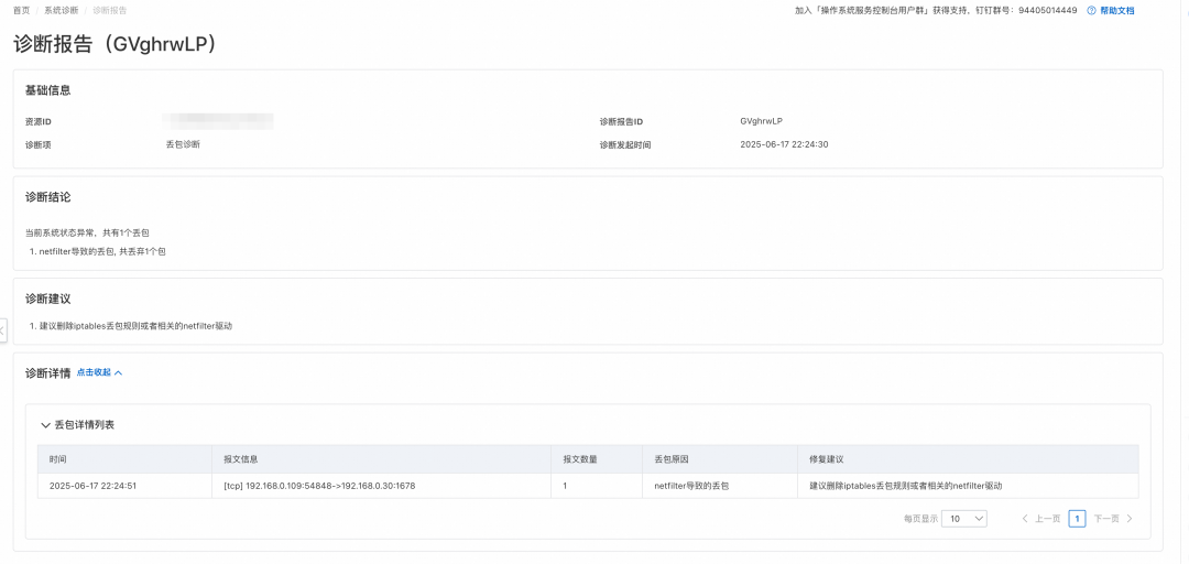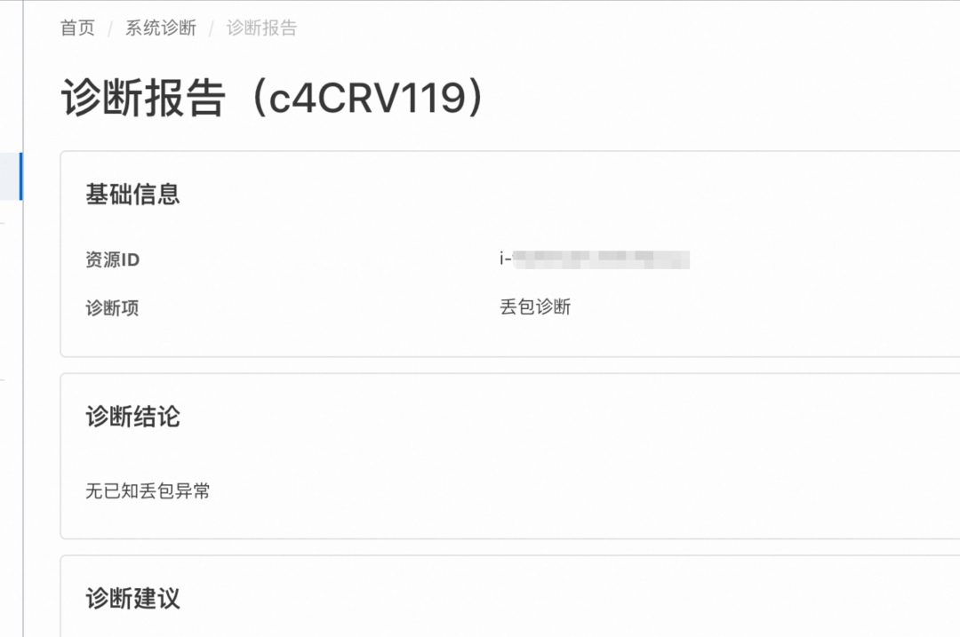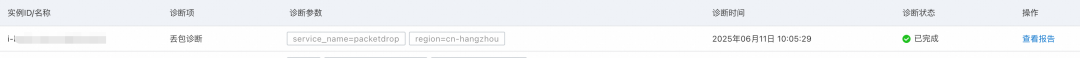 如图上所示,在系统诊断中选择网络诊断、丢包诊断,然后根据第 4 步选择你所需要诊断的实例 ID,最后点击执行诊断。诊断完成以后,点击查看报告,可以看到机器中的丢包情况。