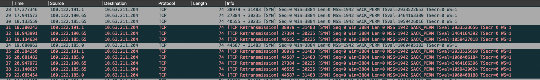我们直接在 ECS 上对 eth0 网卡进行 tcpdump 抓包。从下面的抓包结果来看,source 是 SLB 的健康检查网段,此时 SLB 正不断向本机器发送 SYN 包来请求连接。但是本机并没有返回 ACK 包,导致了健康检查失败了。那好好的为什么我们的机器没有返回 ACK 包呢?