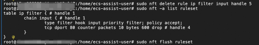 在这个报告中,诊断提示我们需要删除 iptable 丢包规则或者相关的 netfilter 驱动。结论也很明显,就是告诉我们是 netfilter 导致的丢包。既然是 netfilter 导致的丢包,那首先就要看下 nftable 的规则设置: