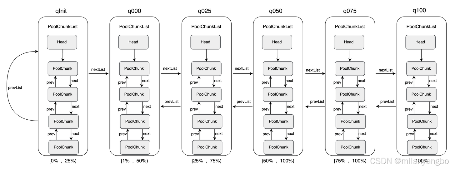 由于单个 Chunk 的大小仅为 16MB,在实际应用中远远不够,因此 Netty 会创建多个 Chunk,并将它们组织成一个链表。这些链表由 ChunkList 持有,而 ChunkLis 是根据 Chunk 的内存使用率来组织的,每个 ChunkList 都有一个明确的使用率范围。