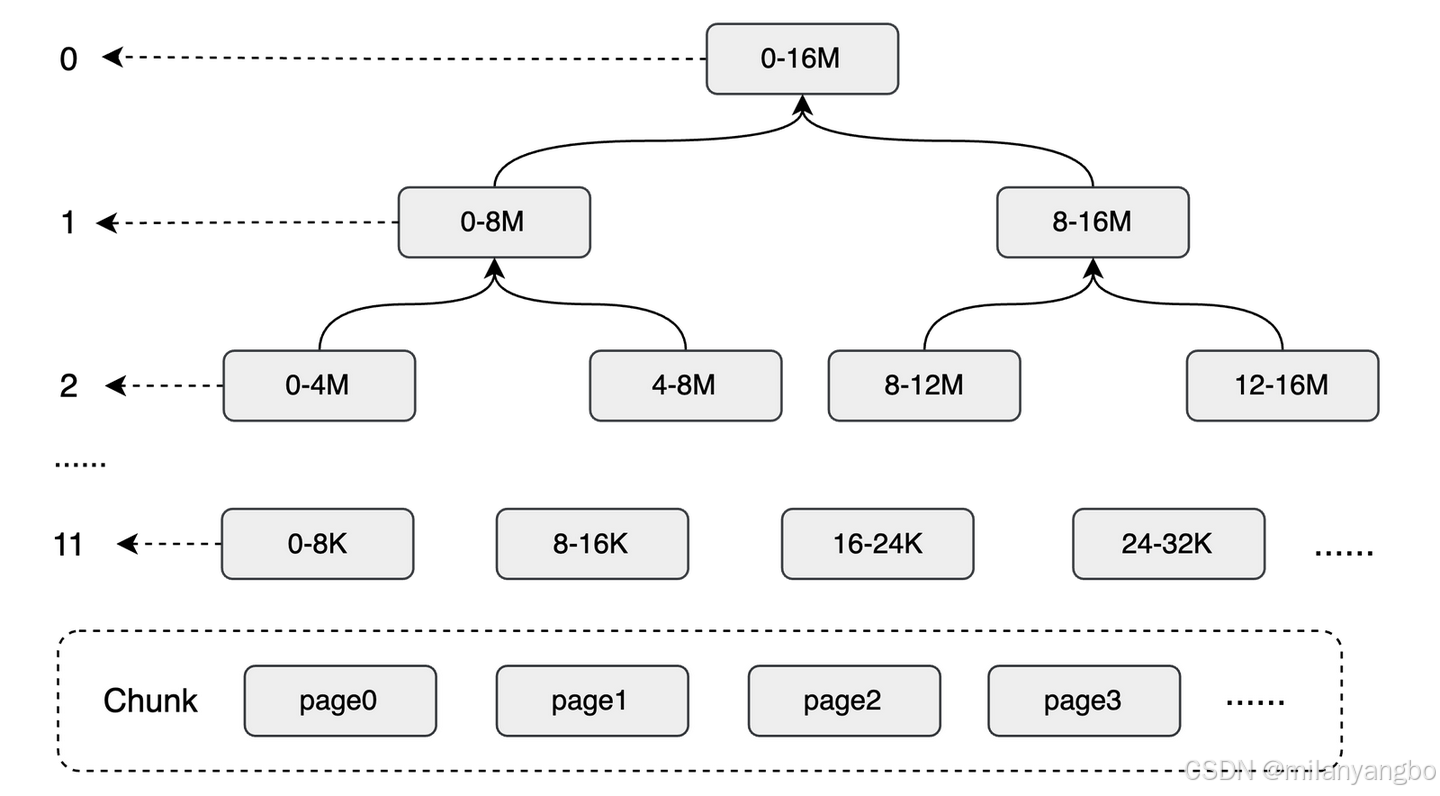 Chunk 内部通过伙伴算法(Buddy Algorithm)管理多个 Page,并通过一棵满二叉树实现内存分配。在这棵二叉树中,每个子节点管理的内存也属于其父节点。例如,当申请 16KB 的内存时,系统会从根节点开始逐层查找可用的节点,直到第 10 层。