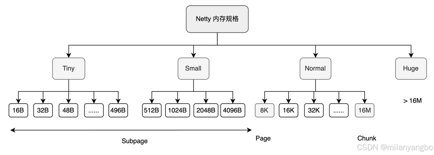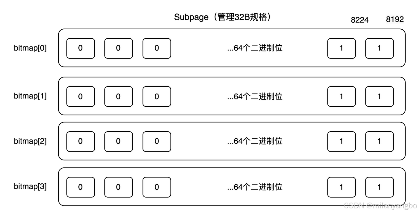 为了提高内存分配的利用率,Netty 在分配小于 8KB 的内存时,不再直接分配整个 Page,而是将 Page 进一步划分为更小的内存块,由 Subpage 进行管理。Subpage 根据内存块的大小分为两大类。1)Tiny:小于 512B 的内存请求,最小分配单位为 16B,对齐大小也为 16B。其区间为[16B, 512B),共有 32 种不同的规格。2)Small:大于等于 512B 但小于 8KB 的内存请求,共有四种规格:512B、1024B、2048B 和 4096B。Subpage 采用位图(bitmap)来管理空闲内存块。由于不存在申请连续多个内存块的需求,Subpage 的分配和释放操作非常简单高效。例如,假设需要分配 20B 的内存,系统会将其向上取整到 32B。对于一个 8KB(8192B)的 Page,可以划分为 8192B / 32B = 256 个内存块。由于每个 long 类型有 64 位,因此需要 256 / 64 = 4 个 long 类型的变量来描述所有内存块的分配状态。因此,位图数组的长度为 4,分配时从 bitmap[0]开始记录。每分配一个内存块,系统会将 bitmap[0]中的下一个二进制位标记为 1,直到 bitmap[0]的所有位都被占用后,再继续分配 bitmap[1],依此类推。在首次申请小内存空间时,系统需要先申请一个空闲的页,并将该页标记为已占用。随后,该 Subpage 会被存入 Subpage 池中,以便后续直接从池中分配。Netty 中共定义了 36 种 Subpage 规格,因此使用 36 个 Subpage 链表来表示 Subpage 内存池。