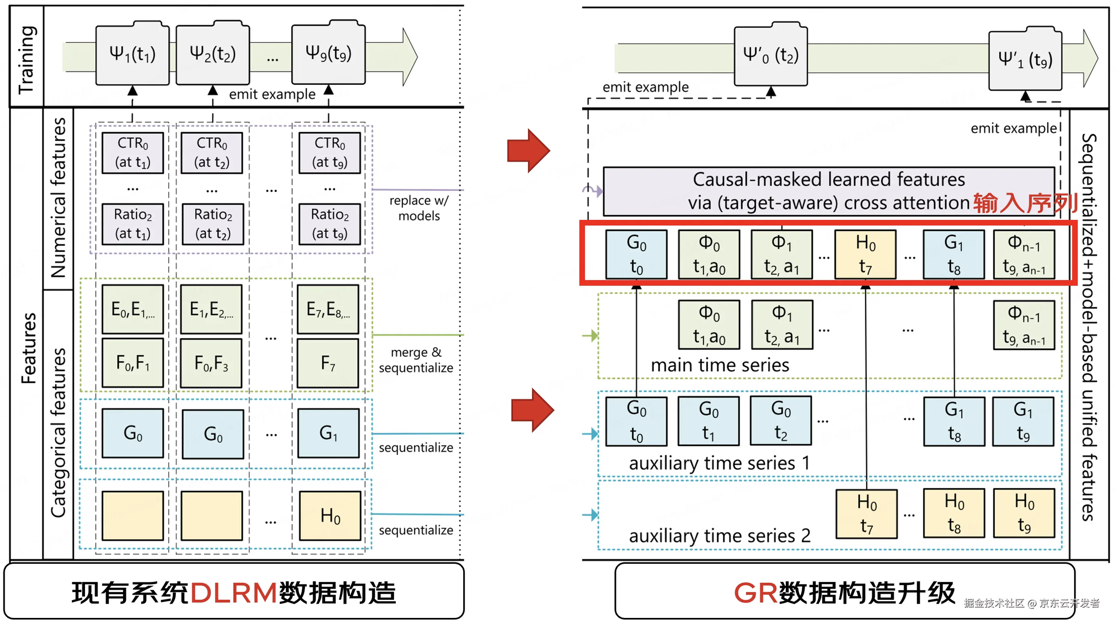 •变化 1:Encoder 结构输入调整为传统 DLRM 稀疏模型结构(含用户基础属性、偏好及行为序列等)。