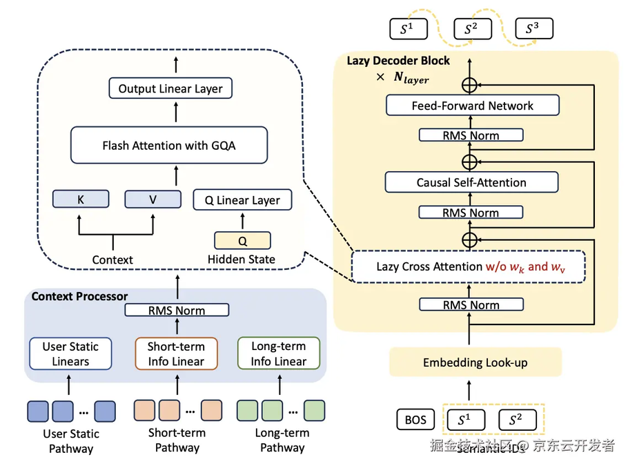 需要注意的是 OneRec V2 模型架构换称“Lazy Decoder-Only”,在笔者看来仍然是 Encoder-Decoder 结构,只是 Encoder 部分去掉了双向 Attention 变简单了,用户行为序列还需要与 CrossAttention 结合,这个是与 LLM Decoder-Only 最关键的区别。