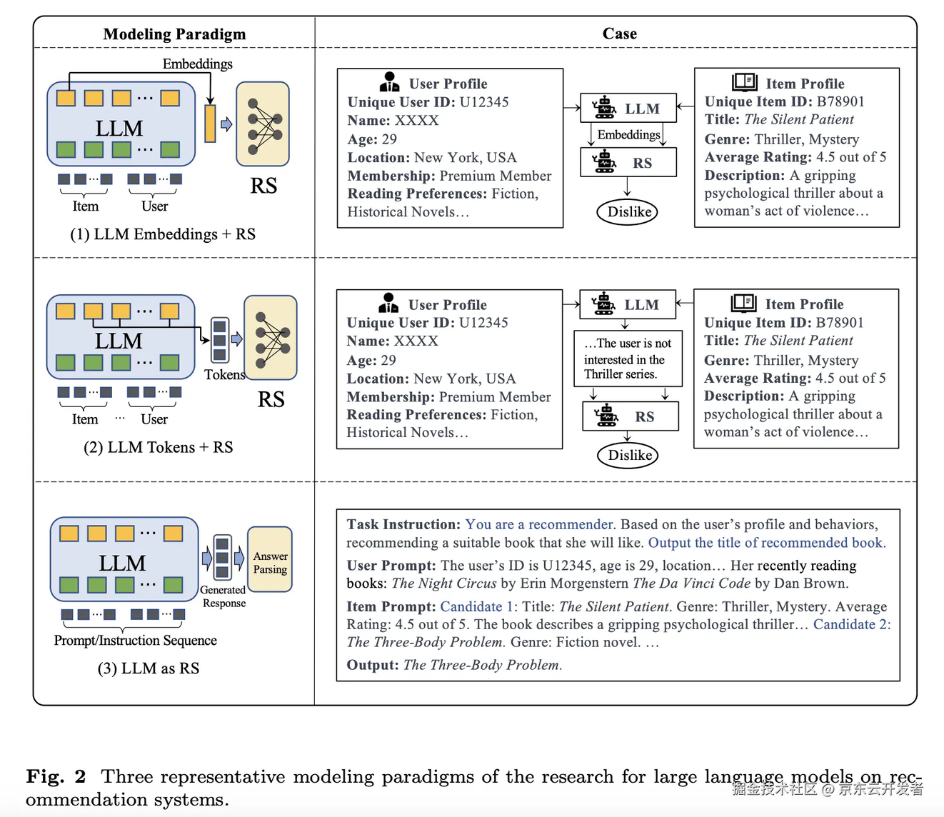 •直接将 LLM 作为推荐系统核心。输入包括用户偏好、用户历史行为以及明确的任务指令(Instruction),由 LLM 生成最终的推荐结果列表。