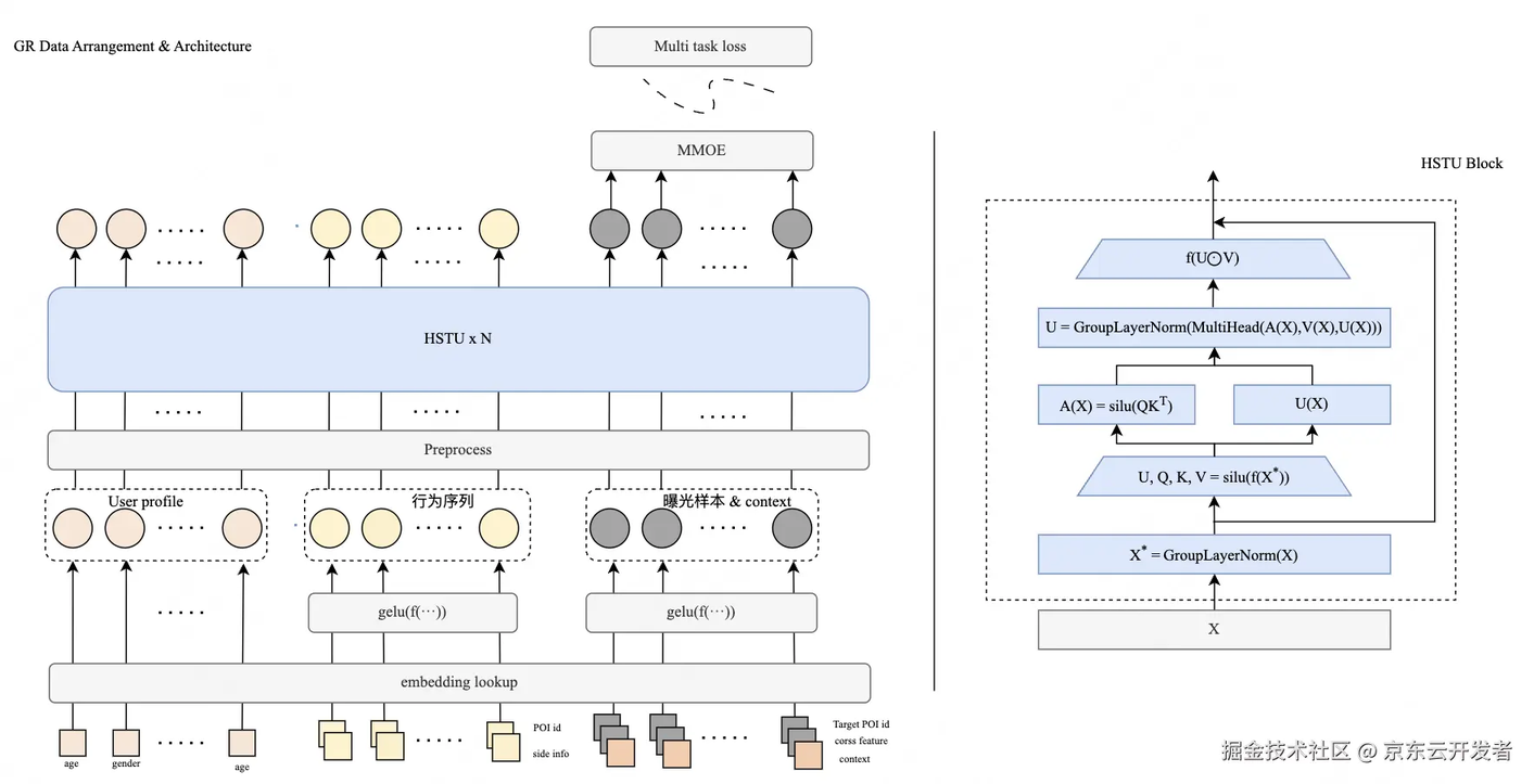 •利用 Group LayerNorm 以及动态混合掩码策略,实现用统一的 HSTU 架构针对不同语义空间的 Token 信息进行编码。