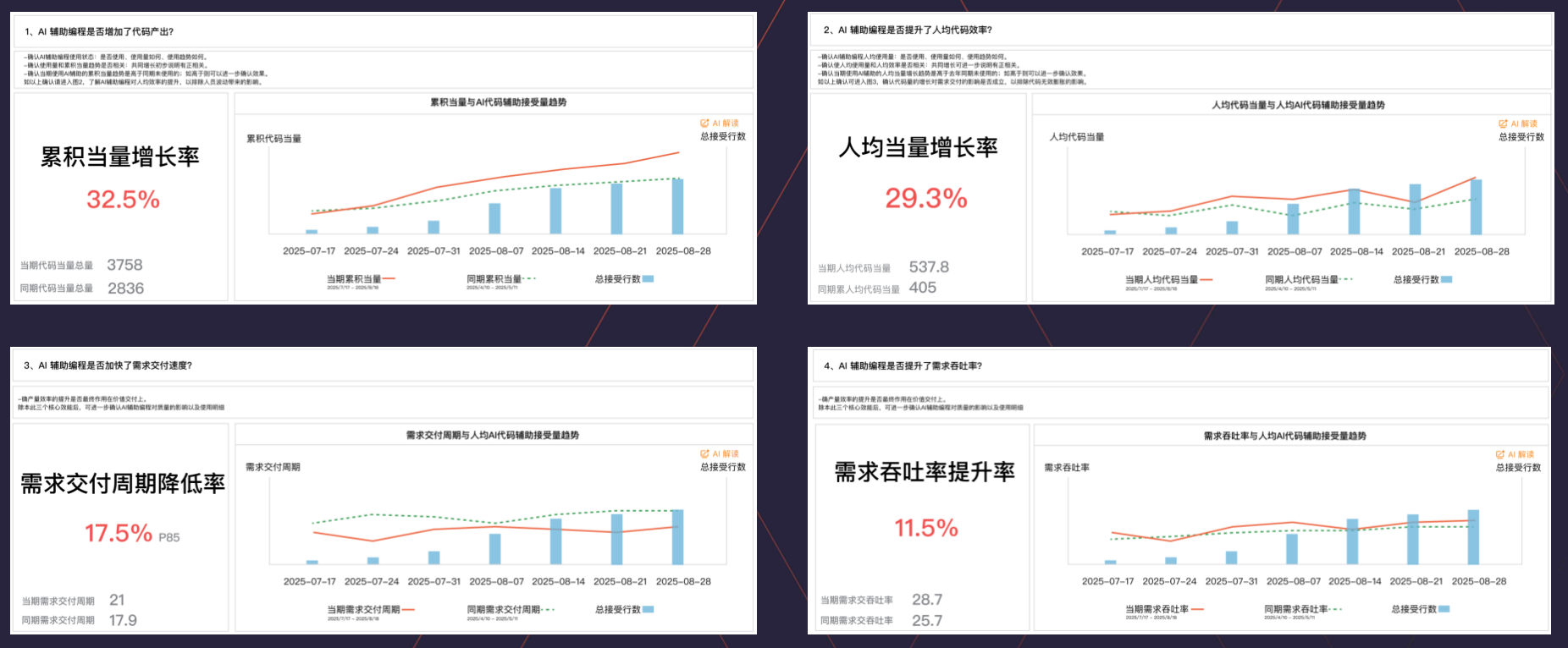 覆盖度指标: 旨在还原 AI 的真实渗透情况。通过“AI 普及率”观测研发环节的应用广度,利用“代码接受率”评估应用深度。两者结合,能够客观验证 AI 工具在编码环节是否真正“落地生根”。