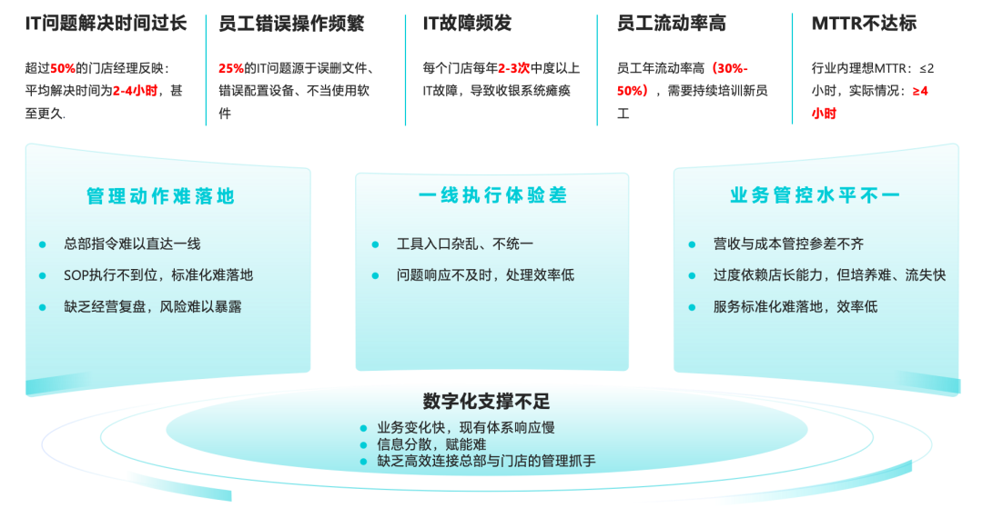 数智化转型下,IT 服务效率已成为制约零售连锁门店高质量、规模化发展的关键瓶颈:
