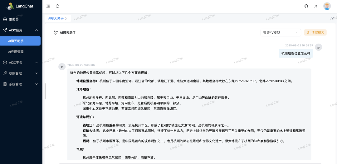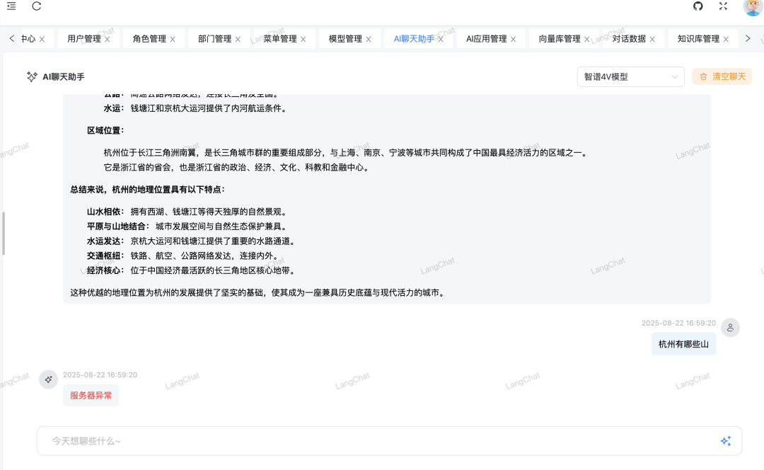 查看调用远程大模型 API 链路信息,可以查看大模型应用与远程大模型调用的状态,耗时,以及该服务的一些系统资源指标。
