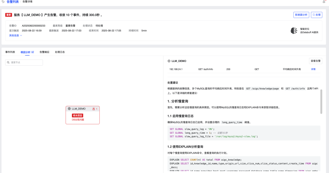 如果开启大模型 AI 配置,根因分析结果后,还会给出推荐处置内容,不但知道哪里有问题,还知道如何进行操作修复。