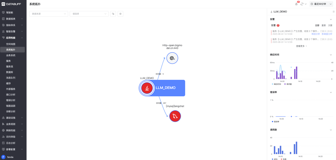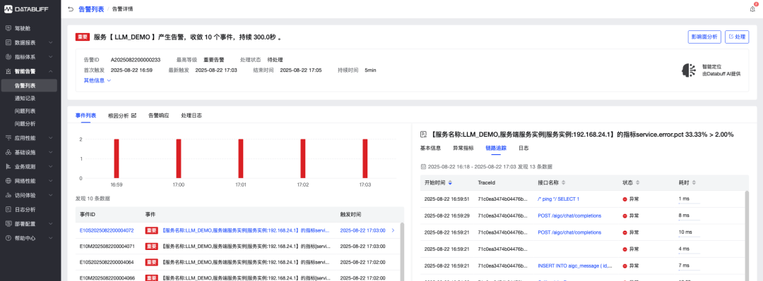 登录 databuff 平台,查看智能告警内容,并查看请求异常链路