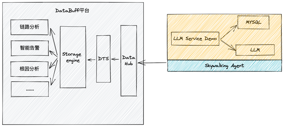 1)右边部署一套大模型 demo 应用,主要包含 3 个组件:LLM service(前端)、MYSQL、LLM;在应用上部署 skywalking agent;