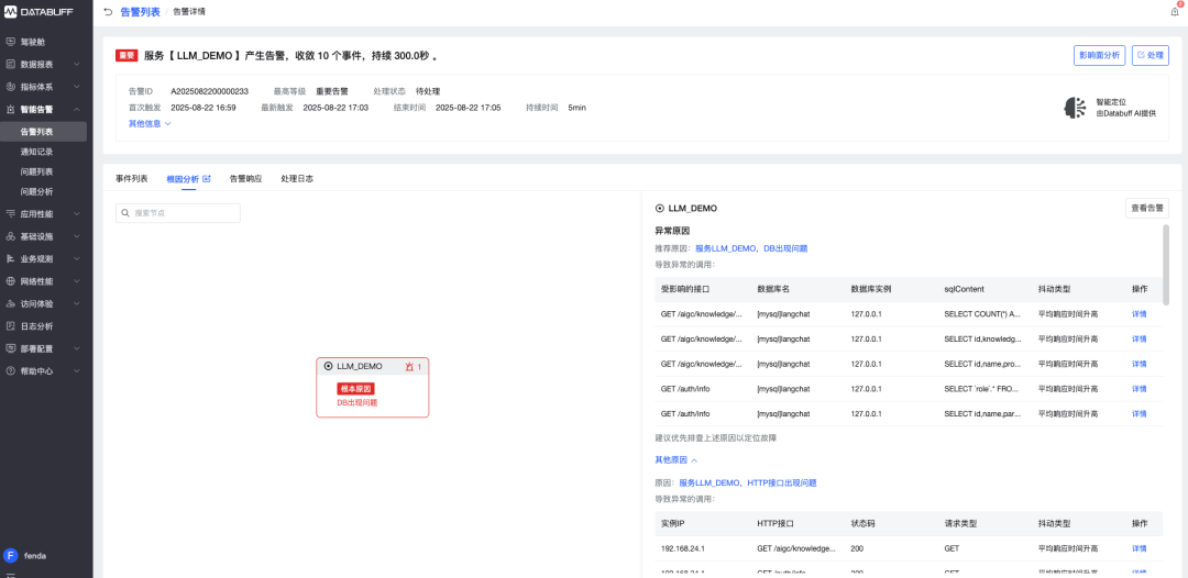 2)使用 databuff 因果 AI 引擎,自动定位 demo 应用的故障原因;