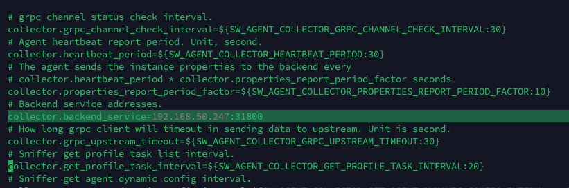 2.数据路由指定:配置 skywalking agent 文件,将数据接收地址指向 datahub ;