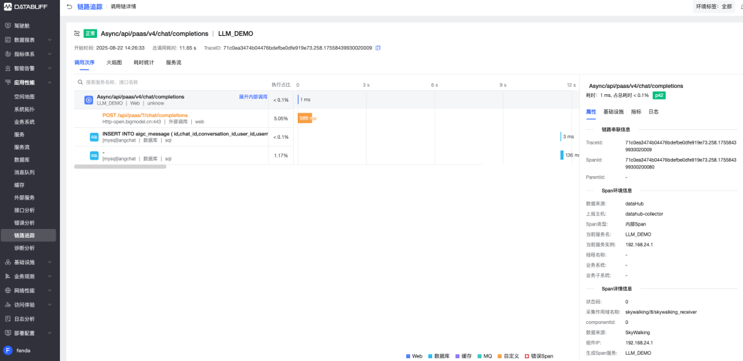 本次演示,我们通过 DataBuff 平台的 DataHub,通过深度整合 SkyWalking 链路数据,为企业提供全栈式智能可观测解决方案。对于很多已经部署了 skywalking 的客户,他们可以直接把数据路由到 databuff 平台,即将享受分钟级的应用性故障定位能力。