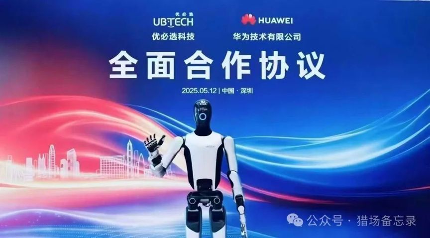 2025 年 5 月 12 日,[华为]与全球人形机器人第一股[优必选科技]在深圳正式签署全面合作协议;这也是继[乐聚机器人]后,华为第二家合作的国内头部人形机器人创企。