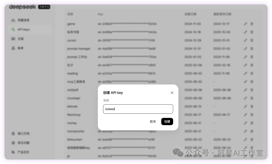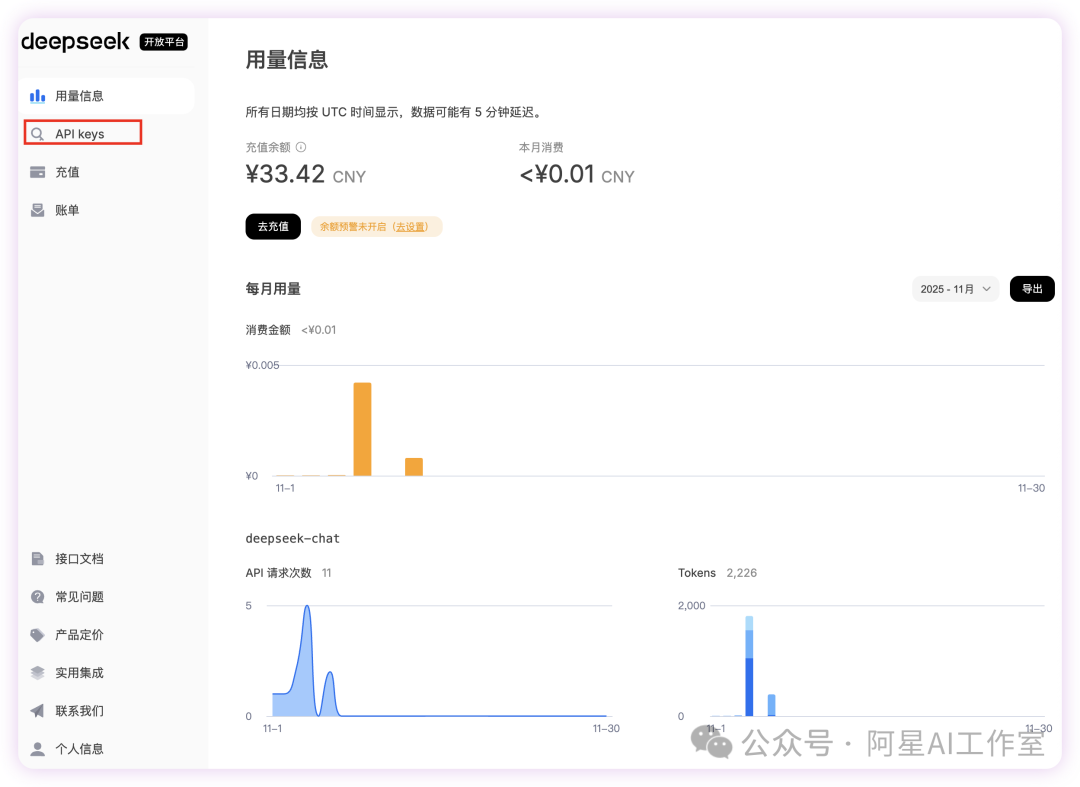 首先我们打开 deepseek API 开放平台(不是你平常用的那个 deepseek 官网,入口在官网的左下角,是开放平台别记错了),获取一个 key。