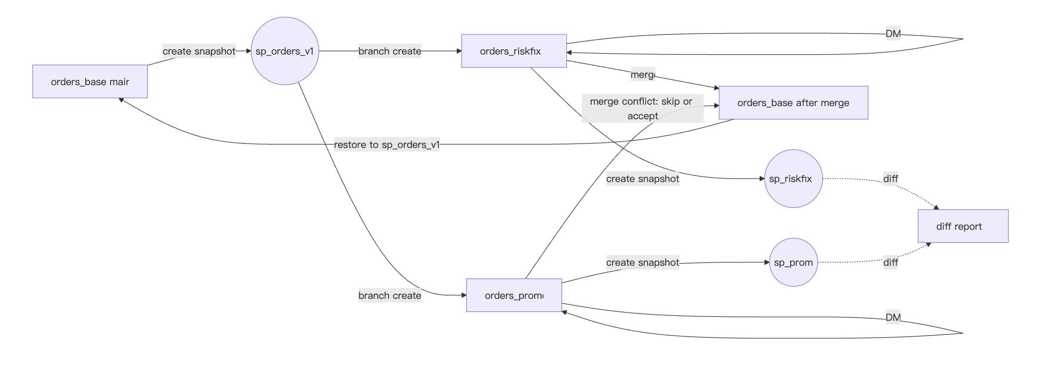 4. 一套完整可跑的 SQL:base → snapshot → branch → dml → diff/merge → restore