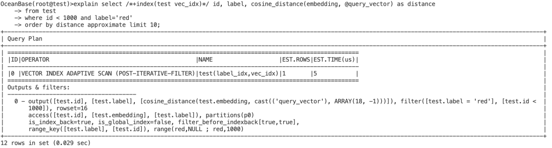 使用标量过滤条件的方法是在向量索引查询中直接带上标量过滤条件。OceanBase 为标量和向量的混合检索实现了多种查询算法,例如前过滤和迭代式过滤算法,可以保证尽可能高的性能和召回率。在 HNSW / HNSWSQ / HNSWBQ 索引上,还实现了执行期算法的自适应选择(IVF / IVFPQ 的自适应将在下个版本提供),这是为了应对代价估计和实际数据的差异,在查询执行时,OceanBase 也会通过执行中的统计信息来修正后续的执行流程。