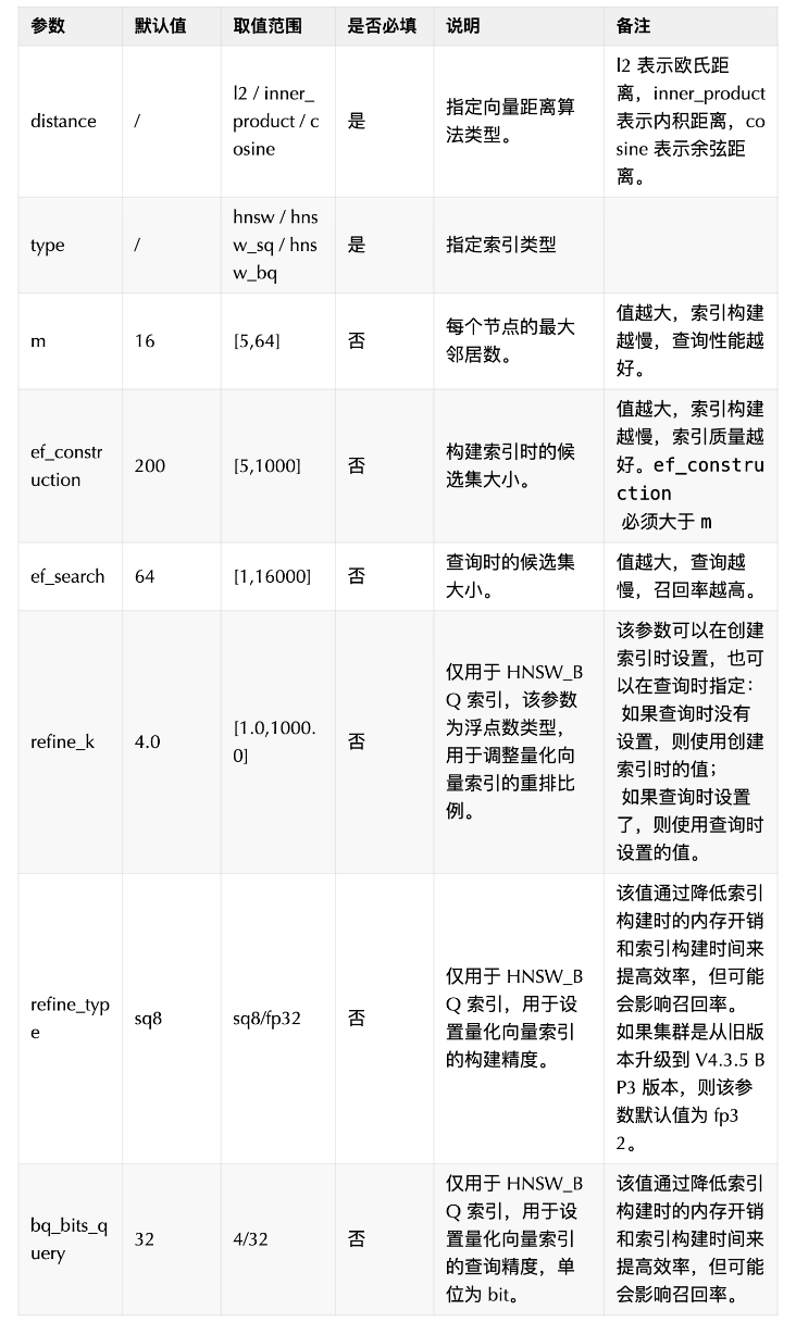 索引构建,查询参数按照单分区内的最大数据量来设定,对于 HNSW / HNSWSQ / HNSWBQ 索引请参考 3.1.1 节,对于 IVF / IVFPQ 索引请参考 3.2.1 节。例如对于 HNSWBQ 索引,1 亿向量,采用 10 分区,那么可以设置 m = 32,ef_construct = 400,查询 top100 是设置查询参数为 ef_search=1000,refine_k = 10。