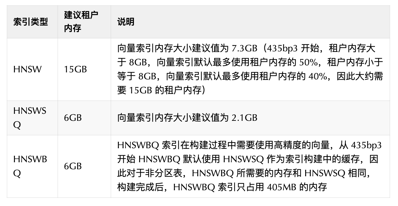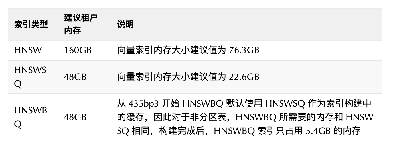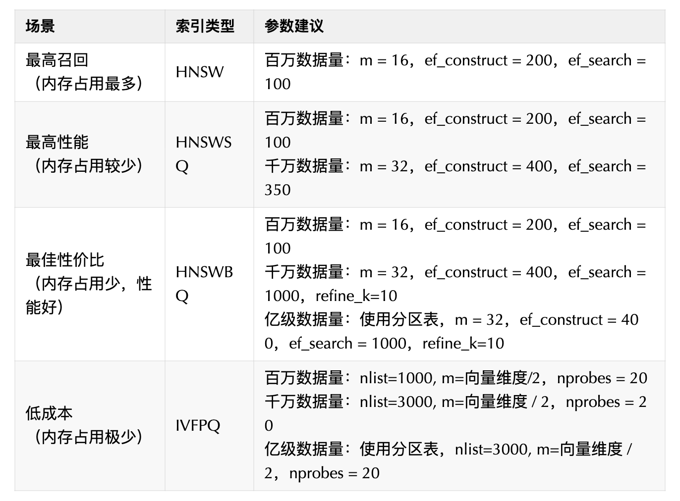 如果最终数据量会超过一亿,建议结合分区表来使用 HNSWSQ 或 HNSWBQ 索引,或者使用 IVF PQ 索引。