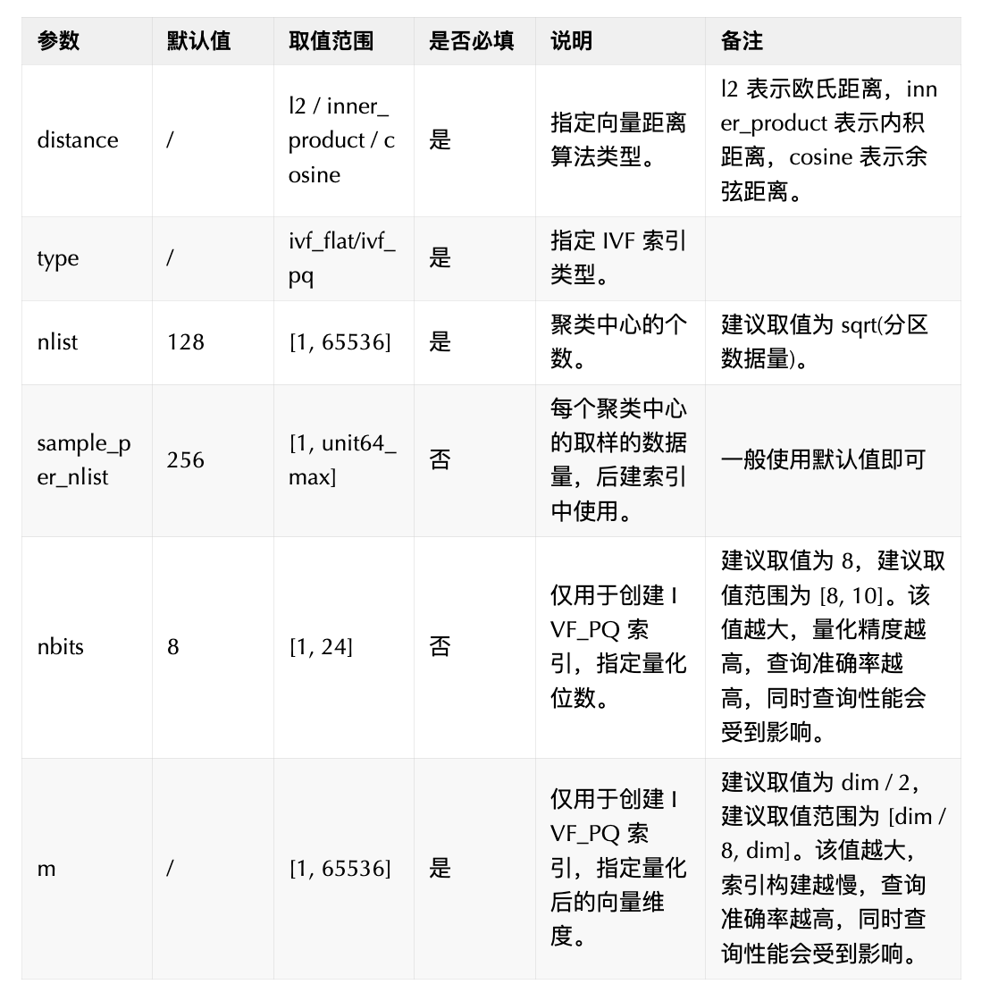 在创建向量索引时,除了指定索引构建参数 m, ef_construction, nlist,也可指定默认查询参数 ef_search, nprobes。查询参数会作为查询时的默认参数使用。