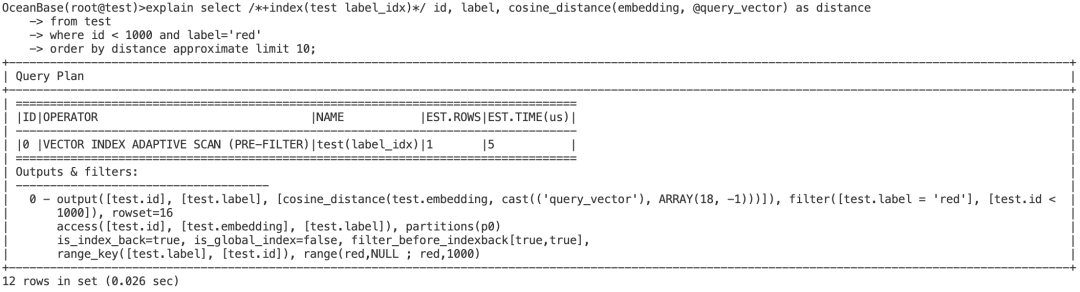 如果标量条件的选择性较好,OceanBase 会选择前过滤算法,并利用最佳的标量索引。因此在标量字段上创建索引可以加速查询性能。 例如对于上面的查询,假设 label='red' 能过滤掉大部分数据,比 id < 1000 的过滤性更好,可以在 label 列上创建标量索引。