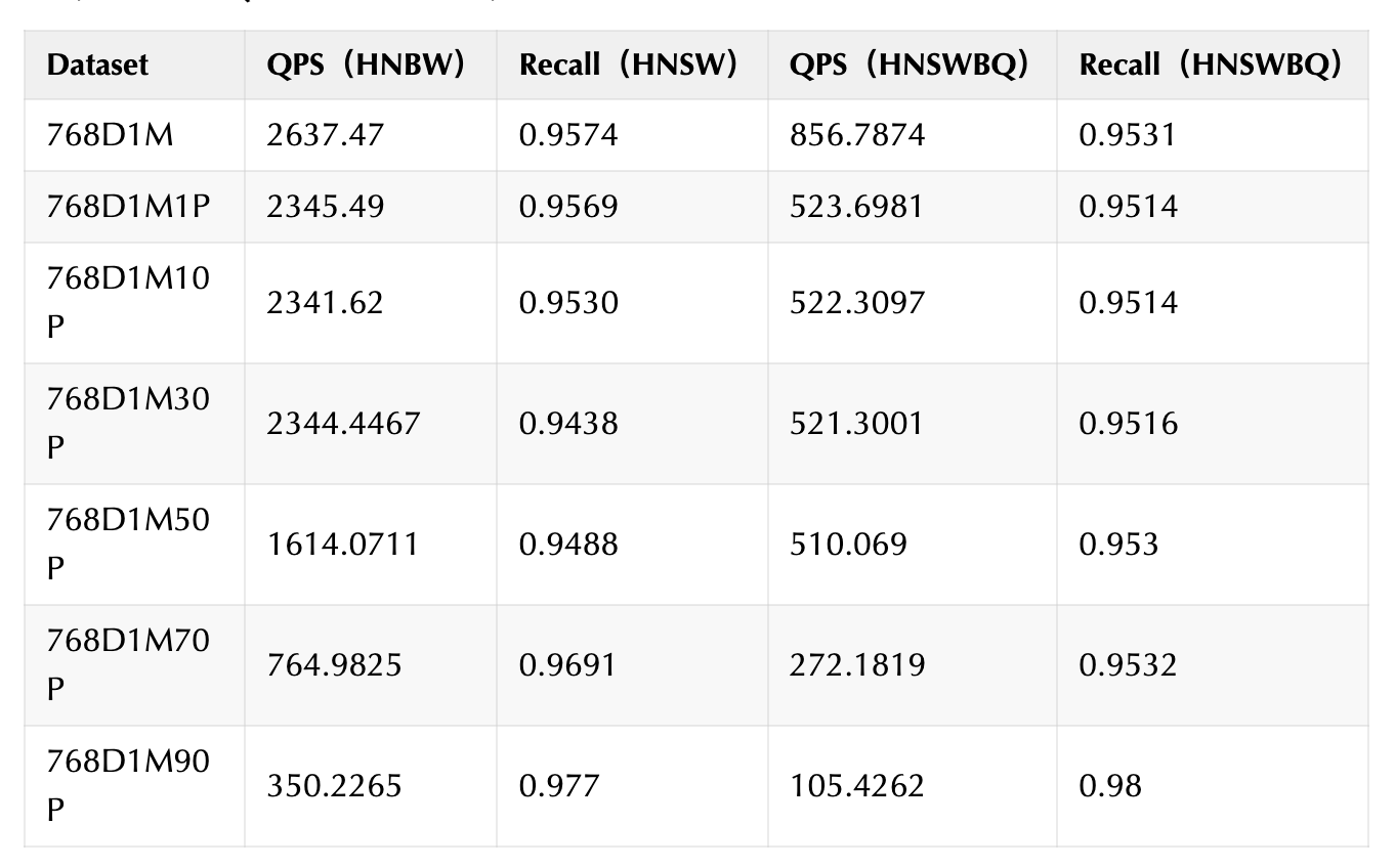 本地相同环境下的性能测试对比:(检索 Top 100,ef_search = 240, HNSWBQ 中额外设置 refine_k = 4)