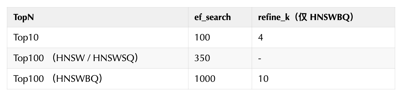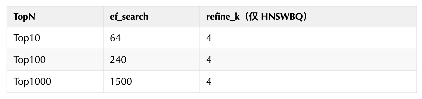 放大 ef_search 和 refine_k(仅 HNSWBQ),可以通过更多的向量计算来提高召回率,但相应的会降低查询性能。在不同 TopN 下可将参数设置为下表中的建议值,如果需要进一步提升召回率,则可将参数值设置得更大一些。
