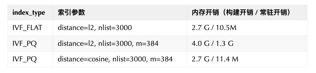 IVF 索引对内存的要求是比较低的,以 1000W 768 维场景为例子,采用推荐参数的情况下,内存开销可以参考下面的表格: