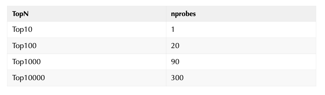 在不同 TopN 下可将参数设置为下表中的建议值,预期可以得到 0.9 左右的召回率,如果需要进一步提升召回率,则可将参数值设置得更大一些。注意,召回率和数据特征有直接关系,下表给出的只是标准数据集下的建议值。