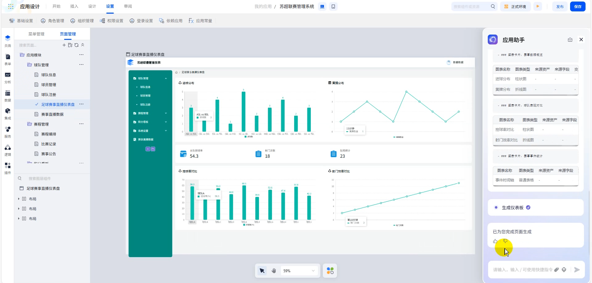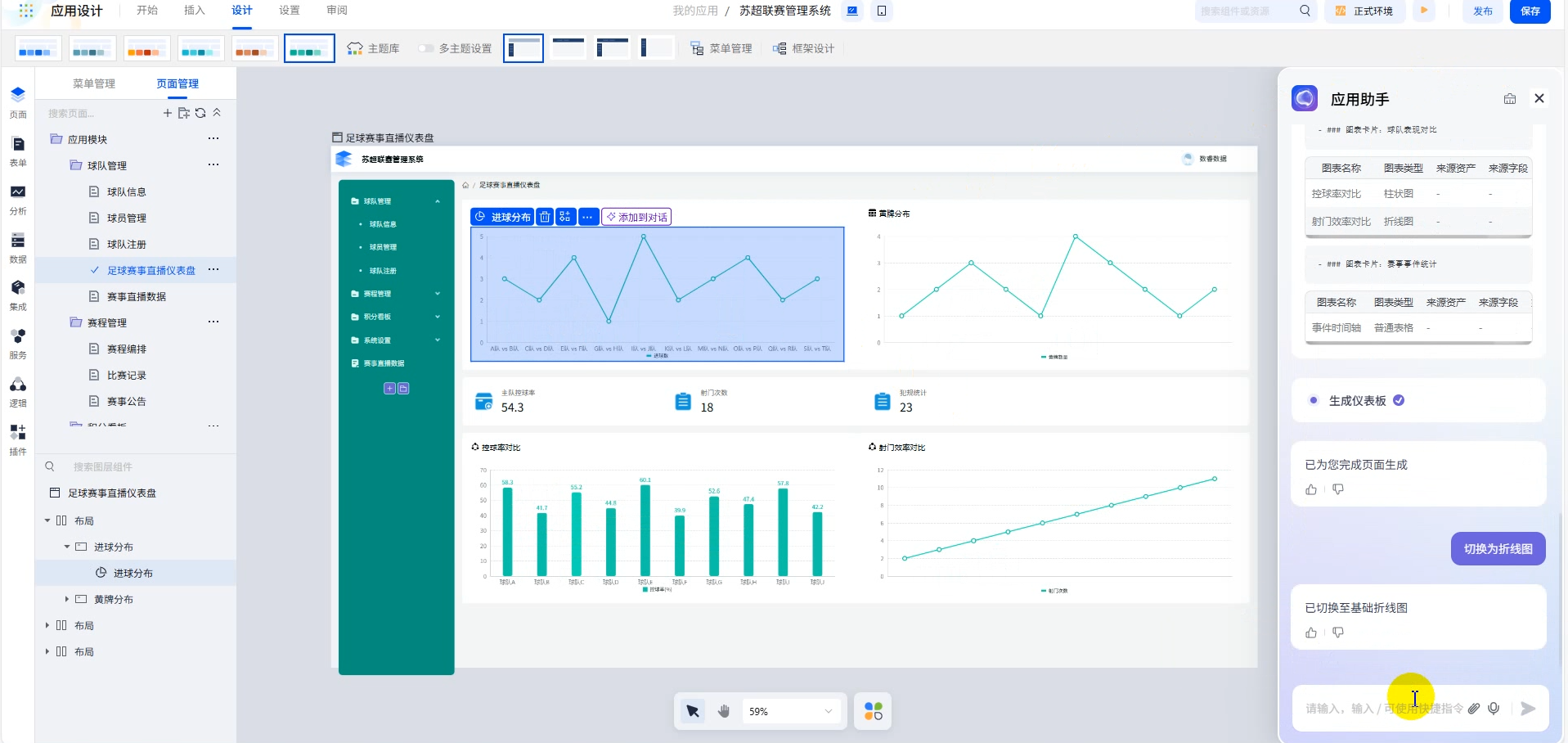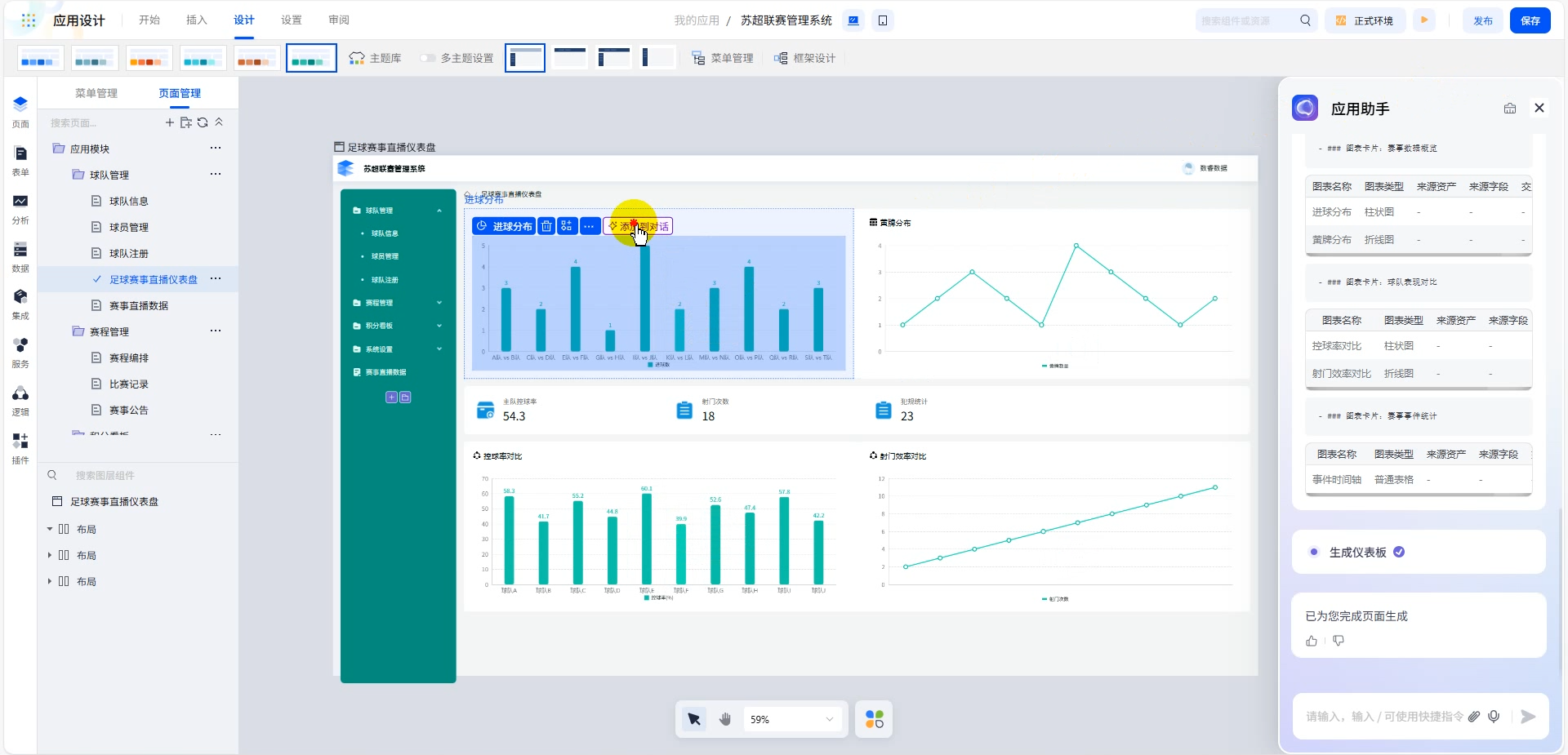 对于苏超联赛来说,赛事直播数据看板是必不可少的功能——主办方需要知道现场球员表现如何、比分是多少,从而实现快速转播。所以在助手里输入“新增赛事直播数据菜单”,自动生成菜单与空白页;继续输入生成仪表看板的指令,AI 会自动生成包含图表、指标卡的看板。