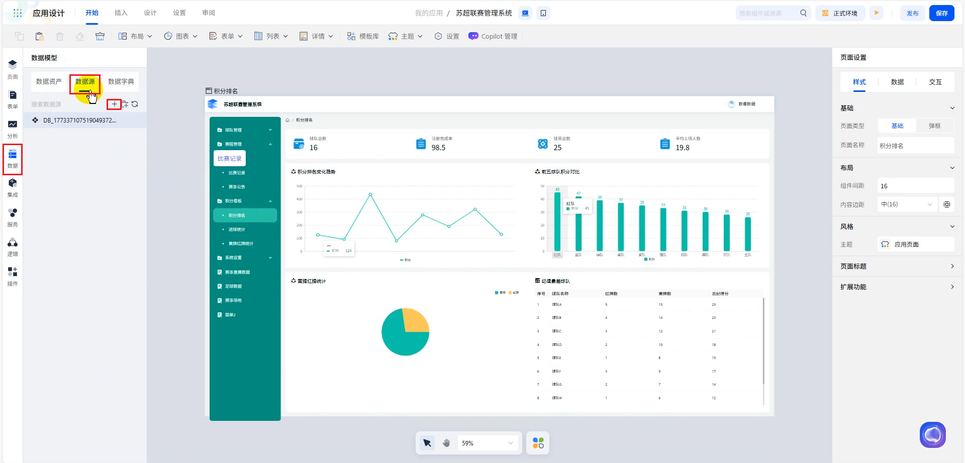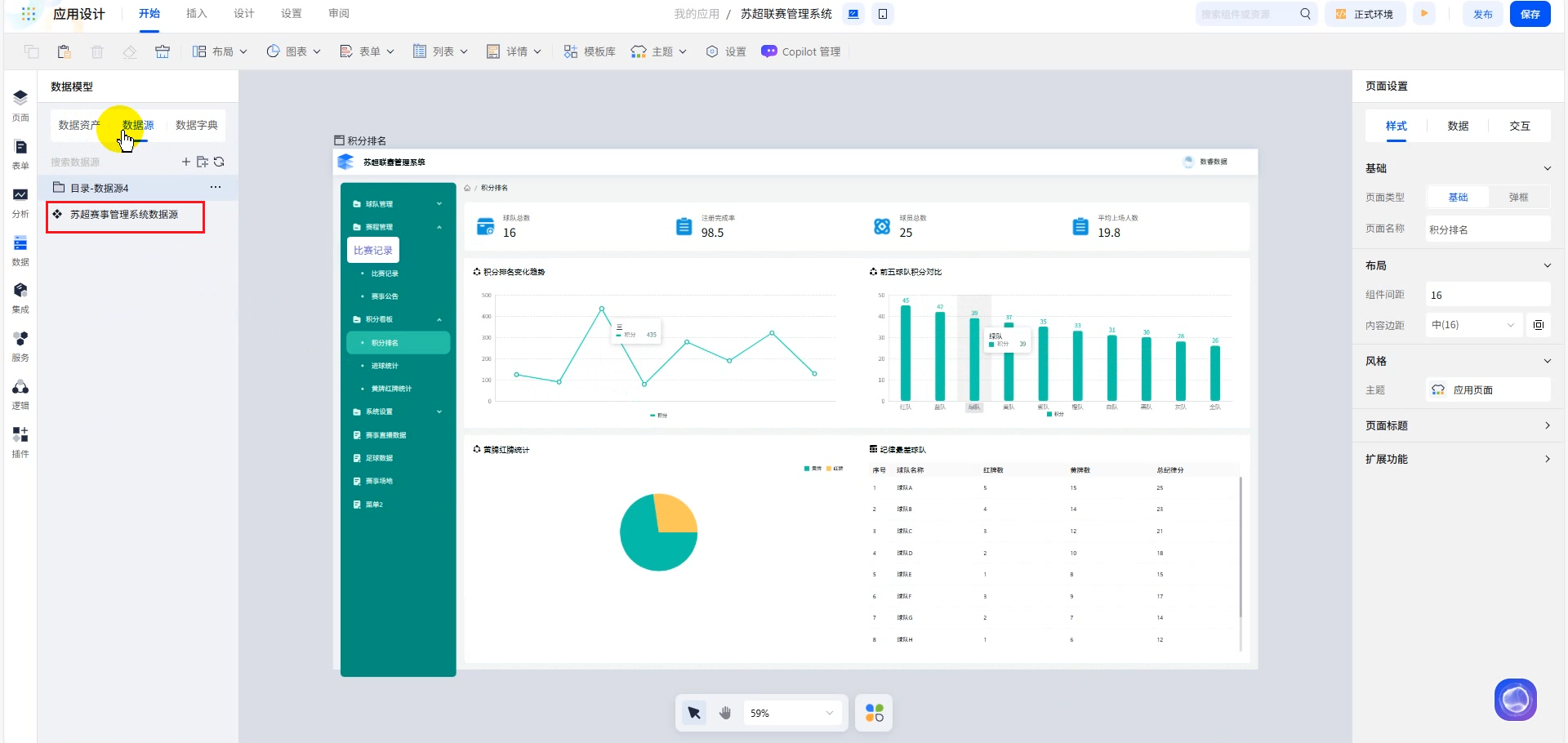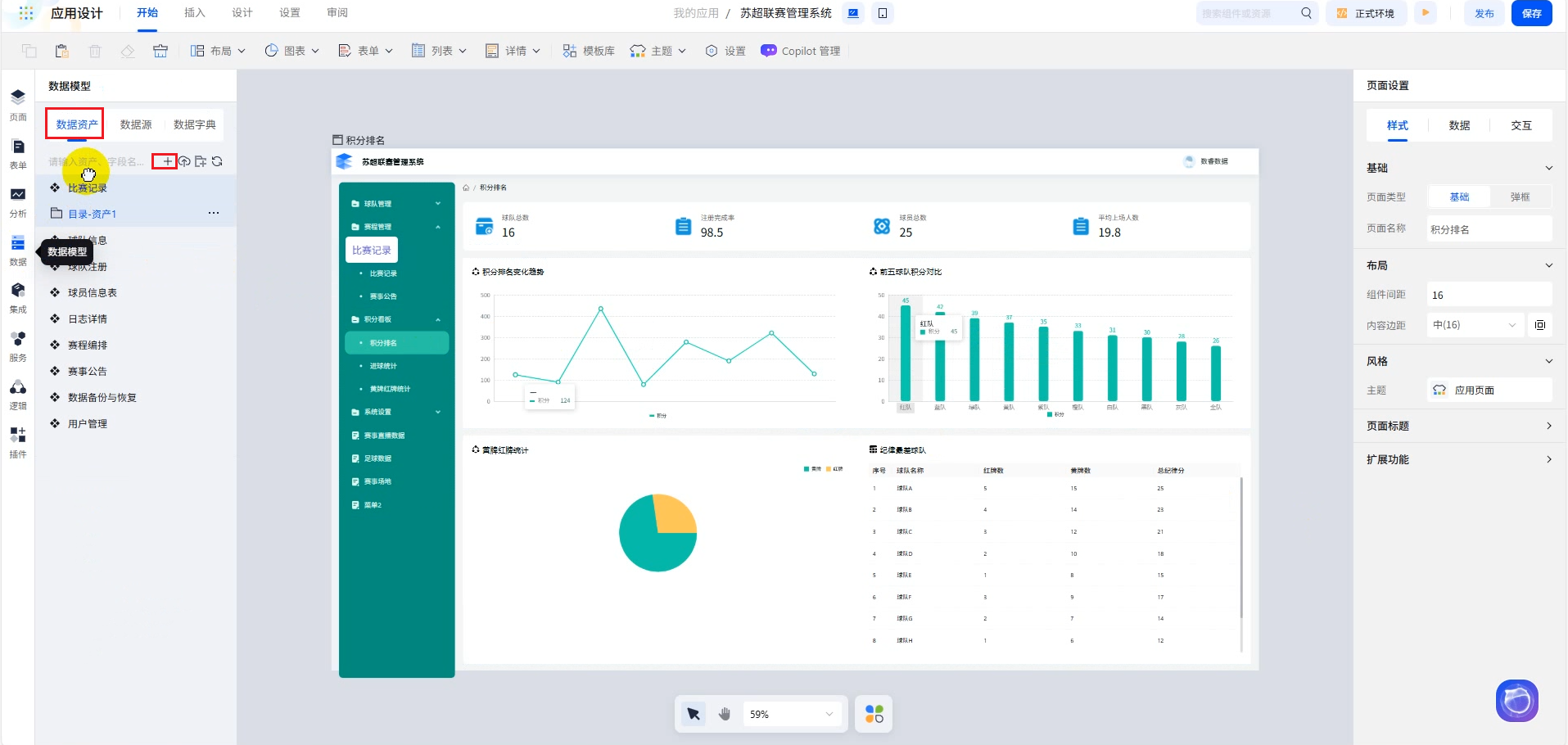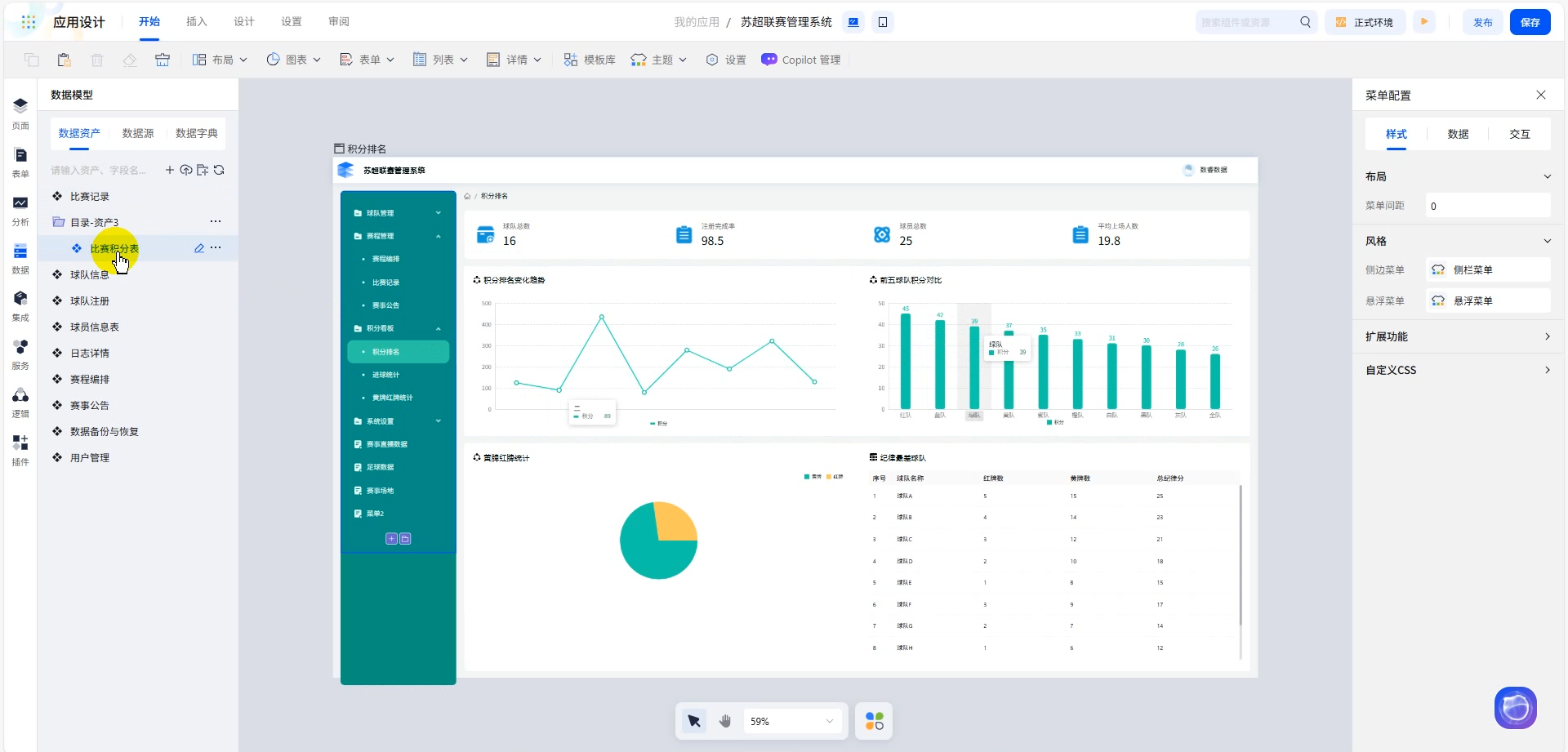 对于苏超联赛来说,赛事直播数据看板是必不可少的功能——主办方需要知道现场球员表现如何、比分是多少,从而实现快速转播。所以在助手里输入“新增赛事直播数据菜单”,自动生成菜单与空白页;继续输入生成仪表看板的指令,AI 会自动生成包含图表、指标卡的看板。
