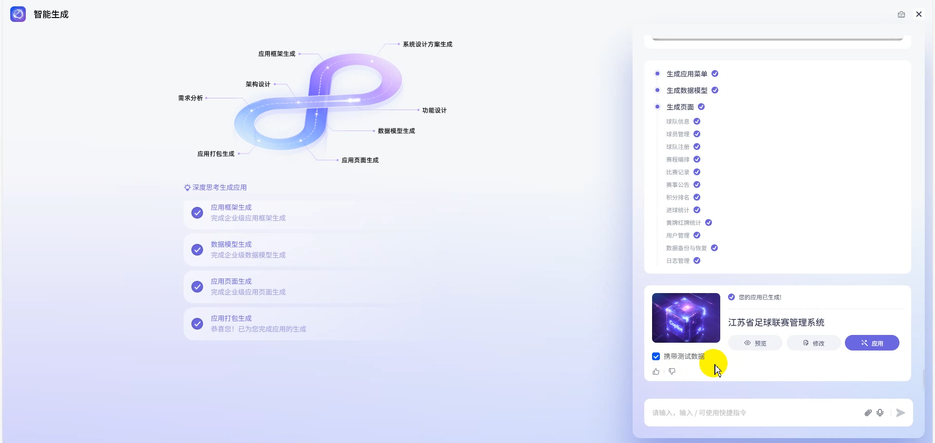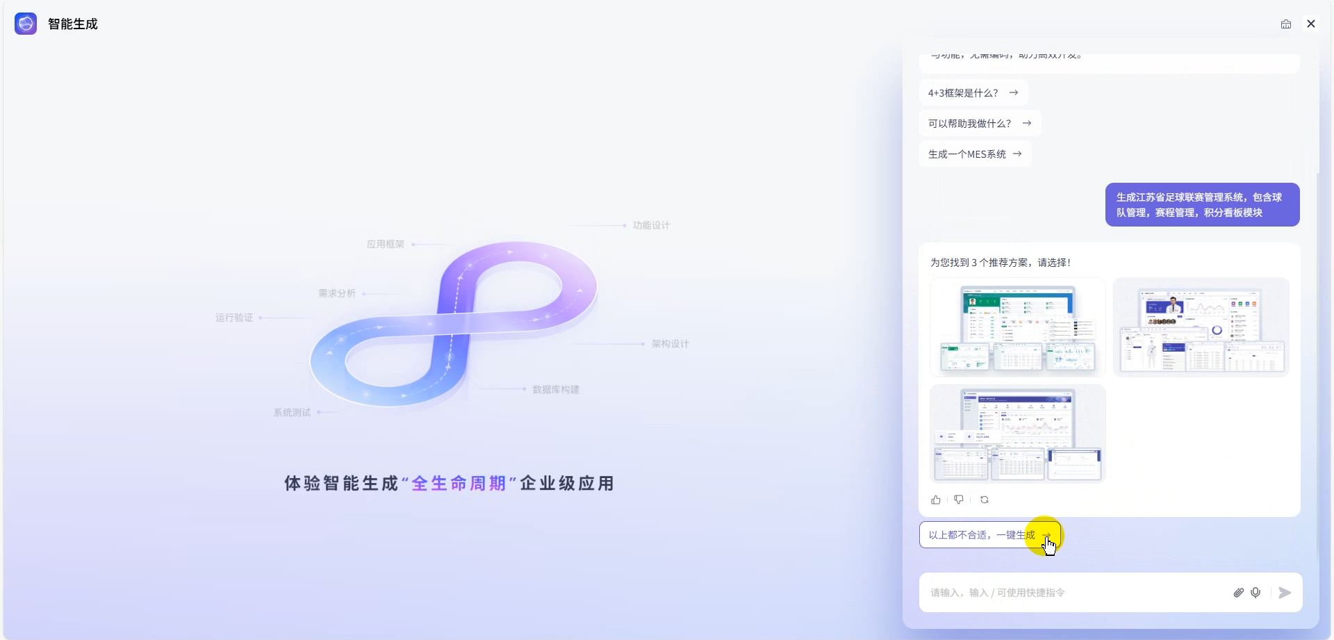 1. AI 生成应用基础框架:无需从零搭建,利用平台 AI 能力直接生成系统原型,省去繁杂的页面配置工作;