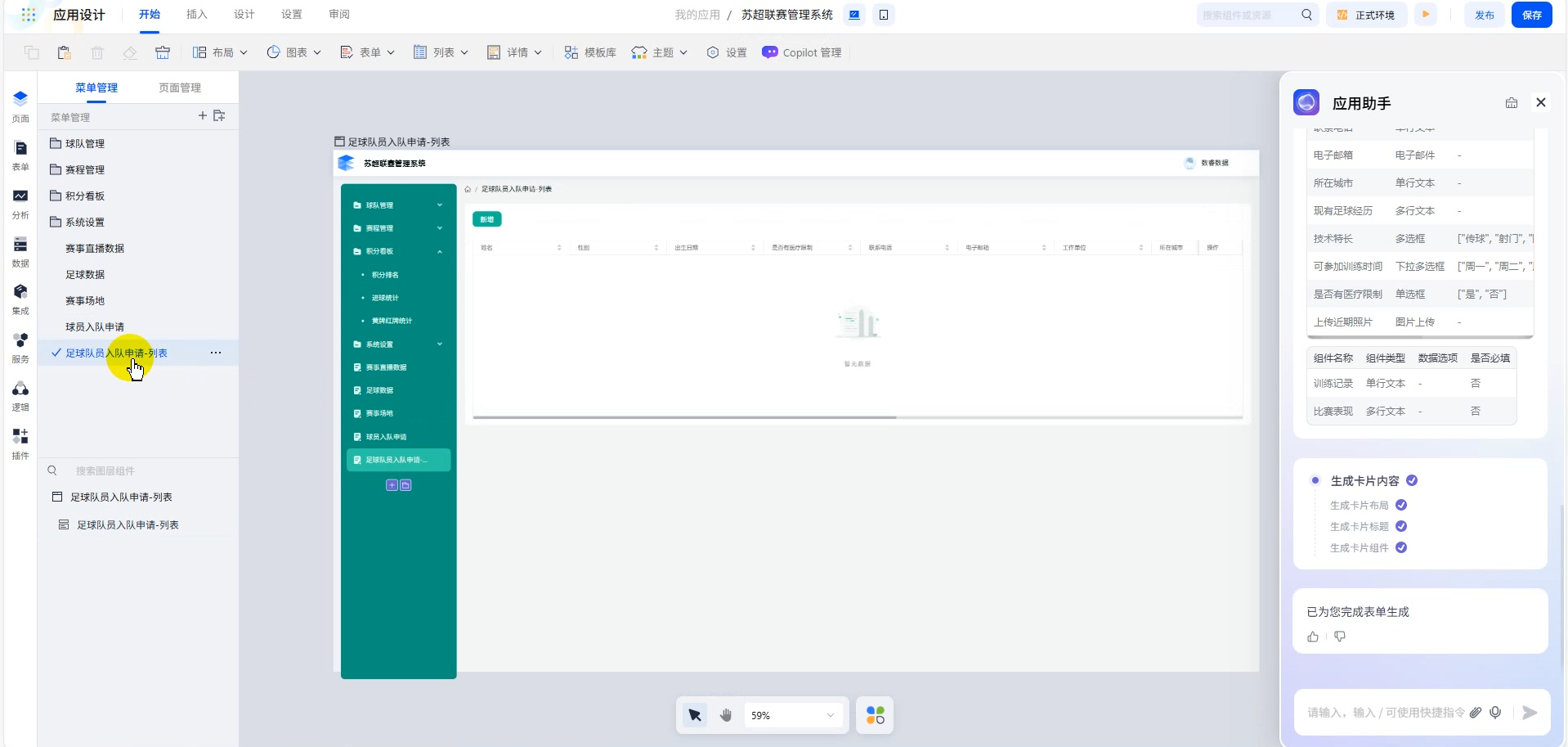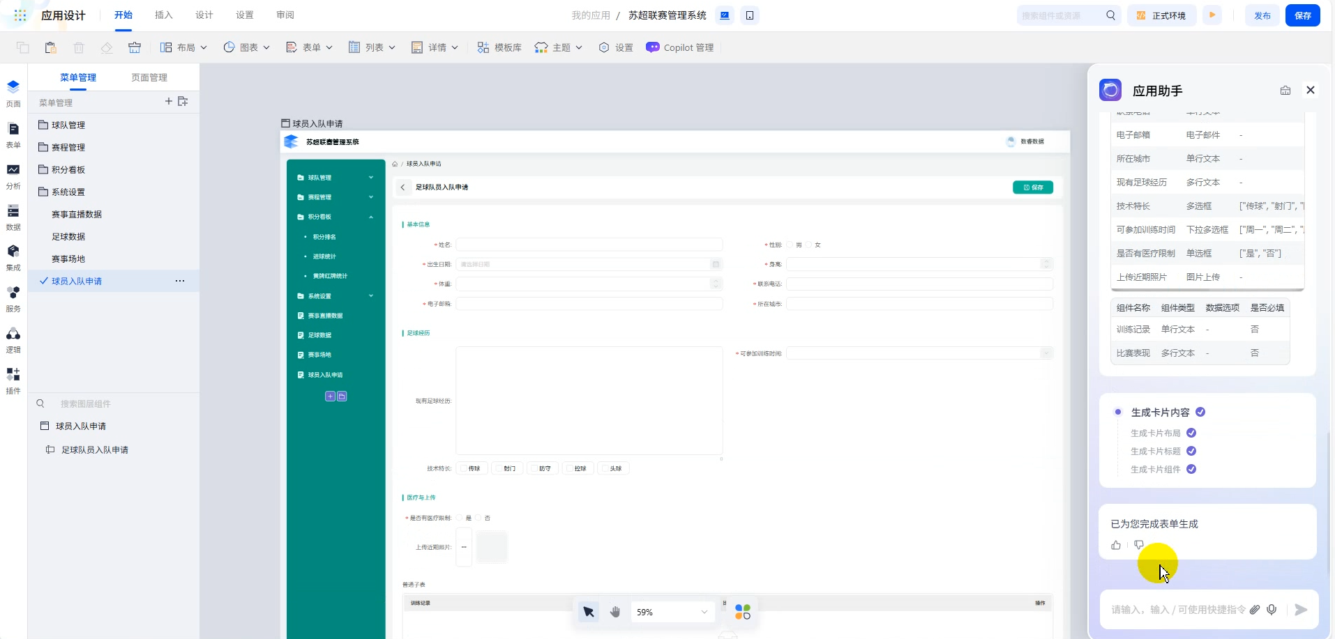 我们先输入指令“新增球员入队申请菜单”创建好菜单与页面后,继续输入“生成球员入队申请表单”指令,AI 就会自动帮我们设计表单需要的字段并且进行布局。我们双击表单进入编辑页做进一步调整。