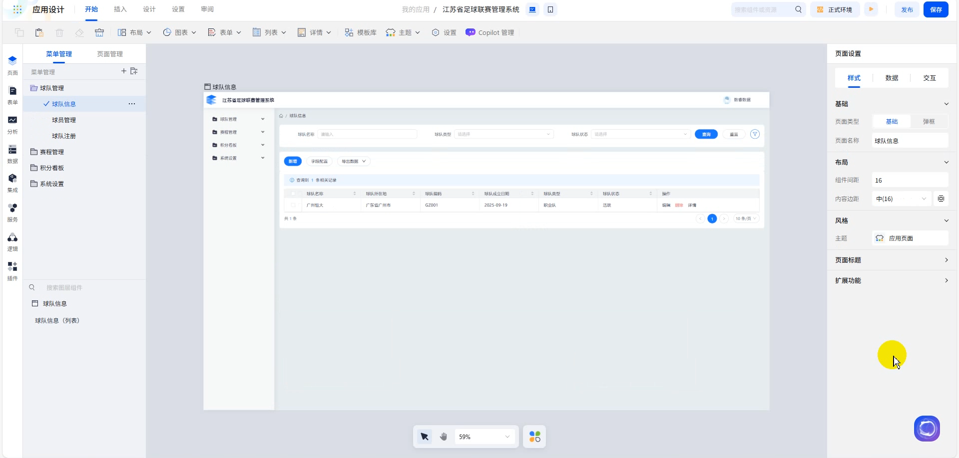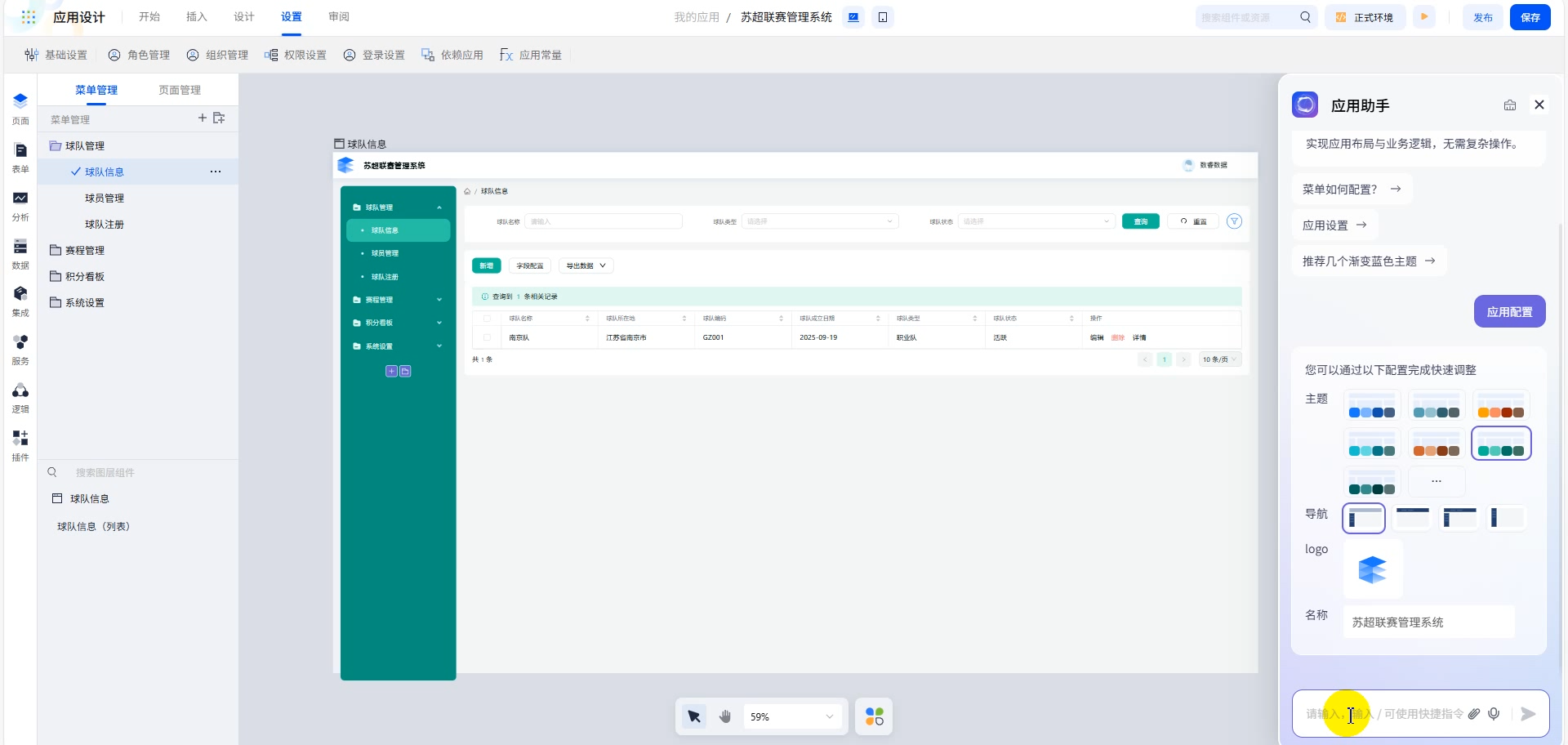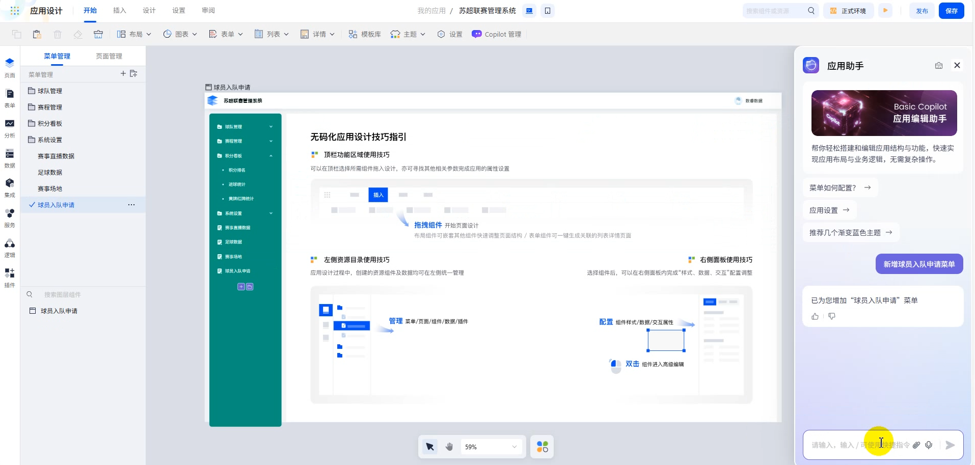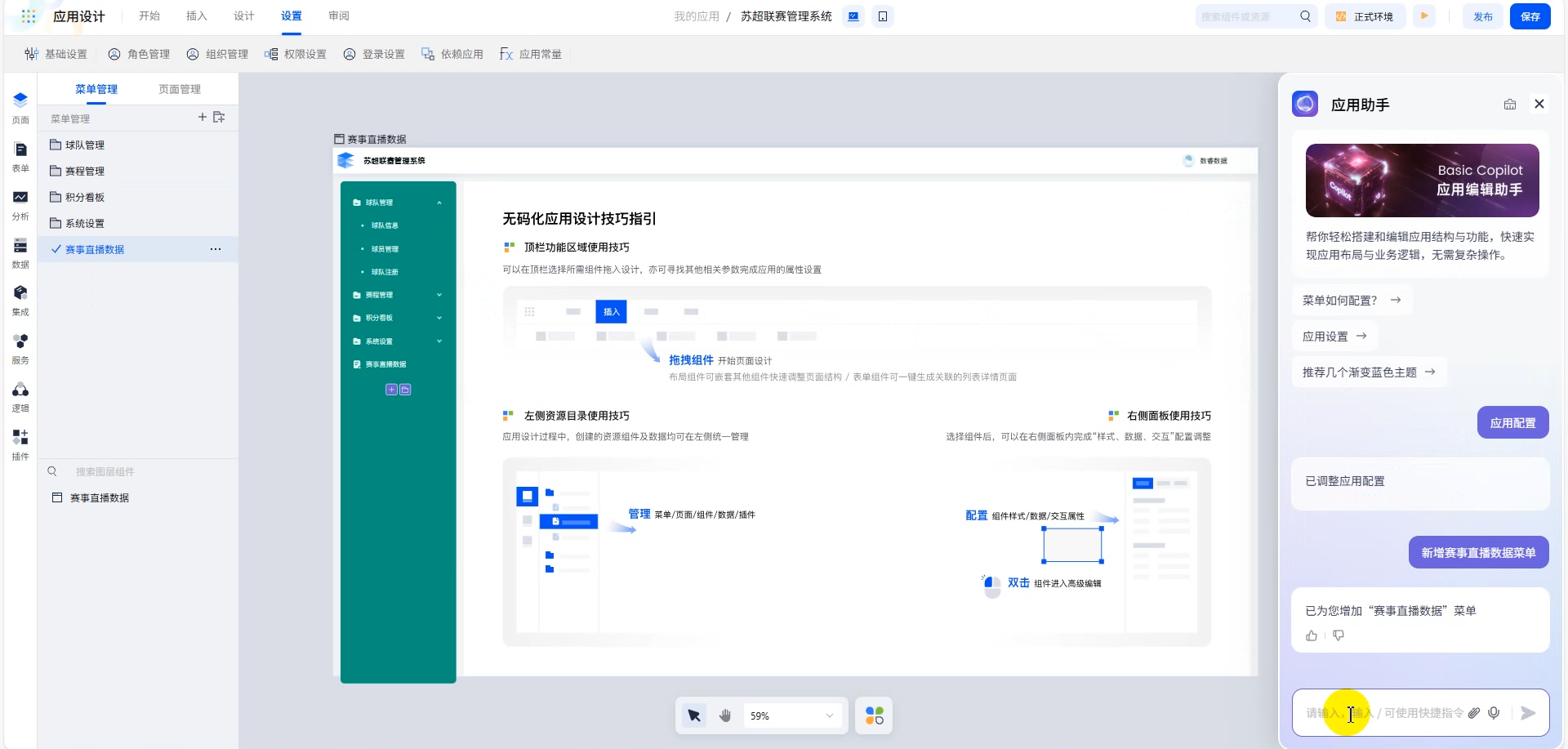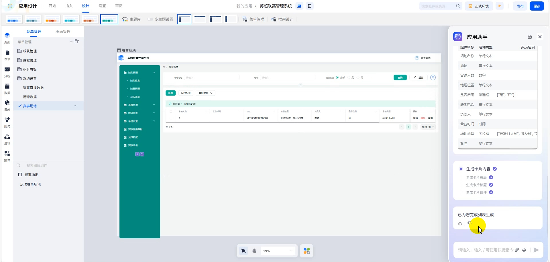 完成系统基础框架搭建后,为使系统更契合赛事管理的实际应用场景,我们使用【应用助手】完成“样式优化”与“新增功能”,操作逻辑简洁灵活,可高效推动系统与赛事管理场景的深度适配。